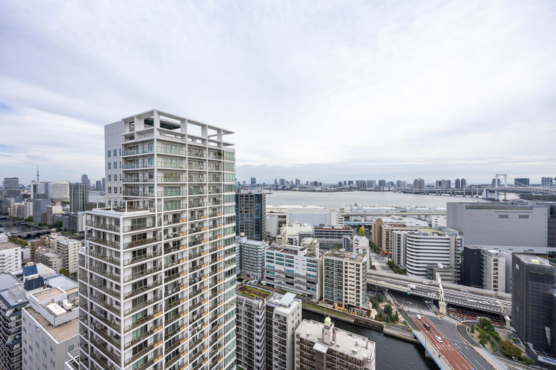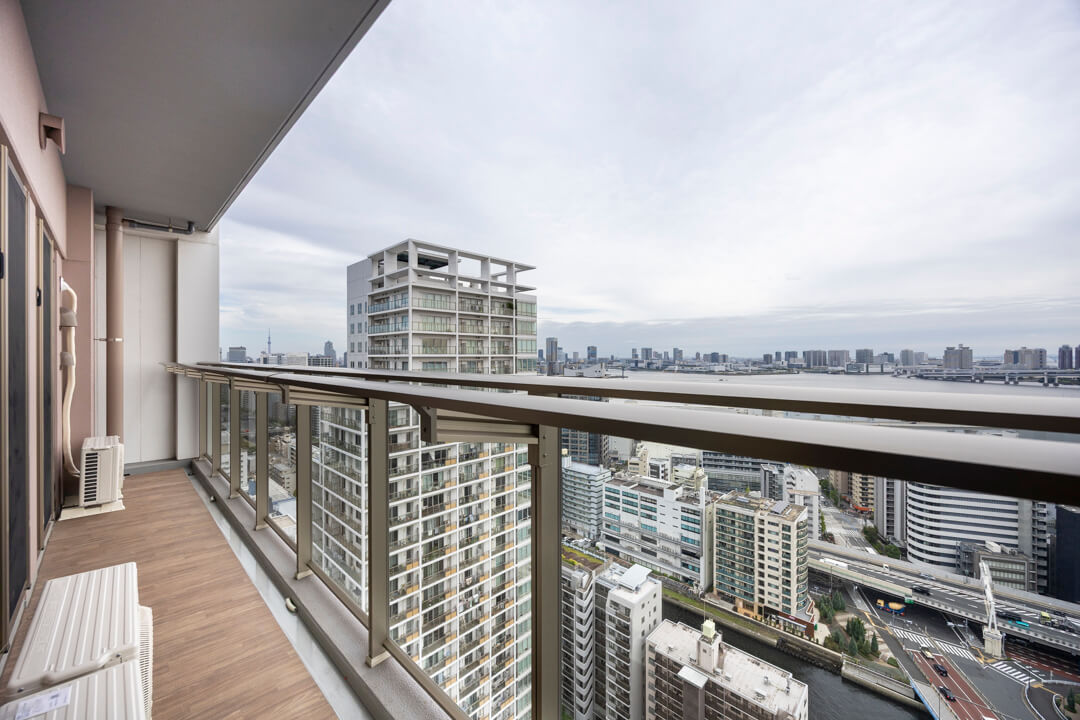約14.26㎡のゆったりとしたバルコニーは、南東向きのため日当たりが良好です。26階部分ということもあり、目の前には海と空が織りなす美しい眺望が広がります。レインボーブリッジや東京スカイツリーなども望め、日中は陽光に輝く海面、夜はベイエリアのきらめく夜景。時間帯によって表情を変える景観が、暮らしに豊かな彩りを添えます。