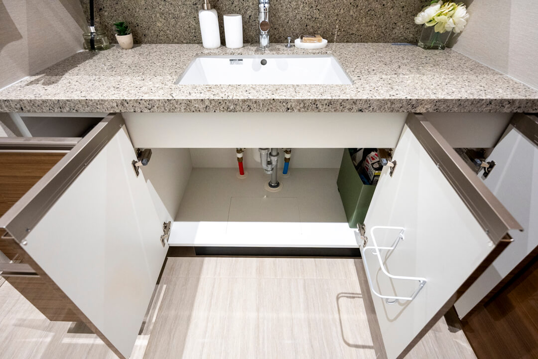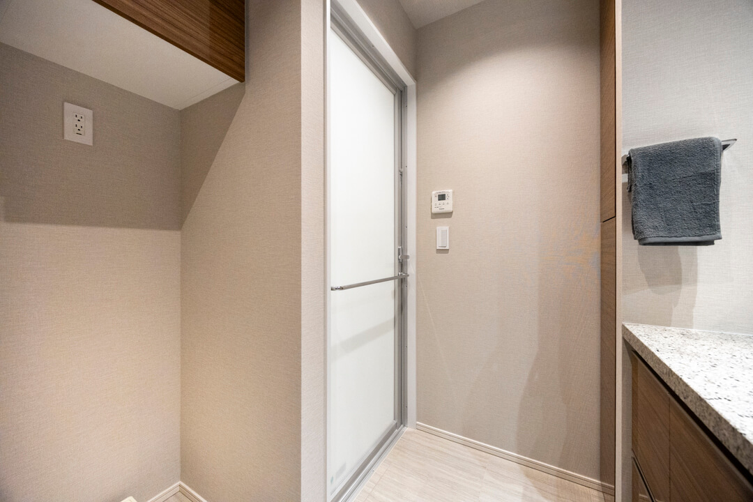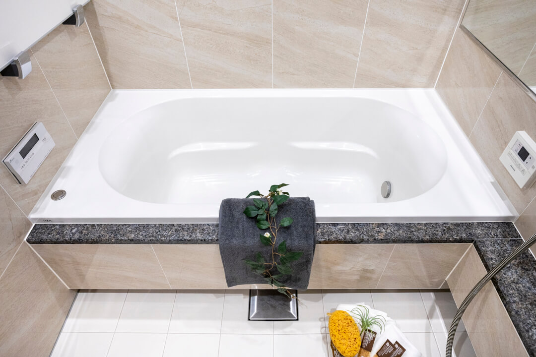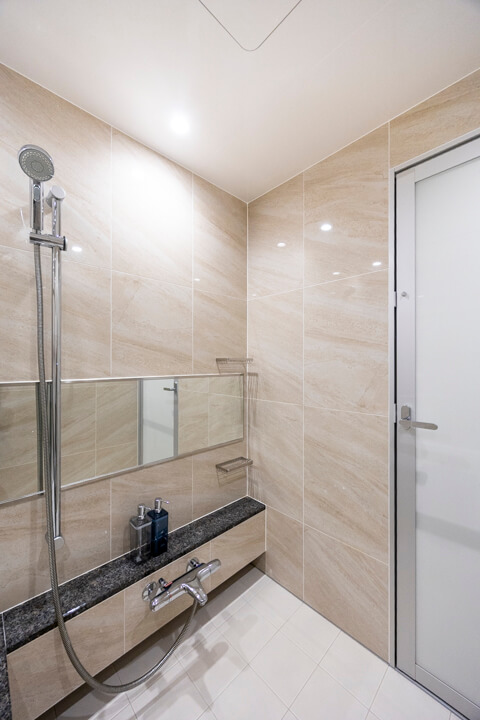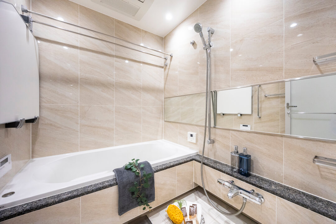 ベージュトーンで落ち着いた雰囲気のバスルームです。お風呂にゆっくり浸かるのが好きという方に嬉しい追い焚き機能を搭載。家族の入浴時間がずれてしまっても安心です。また、浴室乾燥機には暖房・乾燥・換気・ミストサウナの機能がついており、一年中快適に過ごすことができます。