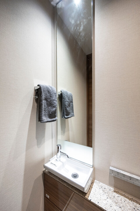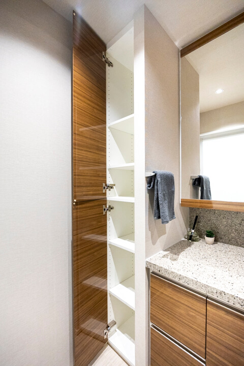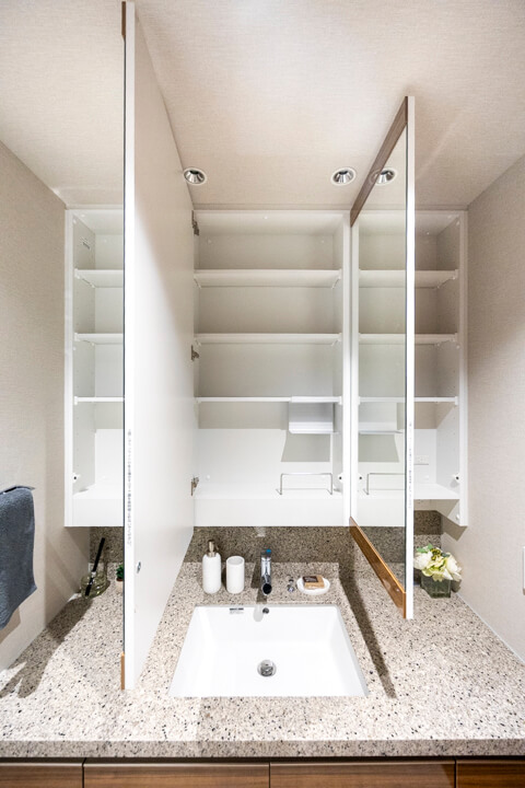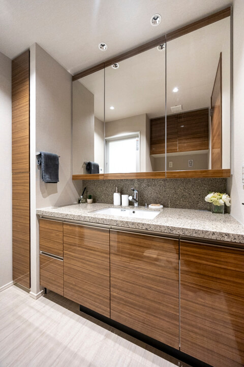 石目調のカウンターが高級感を醸し出している洗面化粧台です。大きな三面鏡の中には、化粧品などが収納できて使い勝手良好。横にはリネン庫が造られているので、ごちゃごちゃしがちな洗面まわりもきちんと整頓することができます。