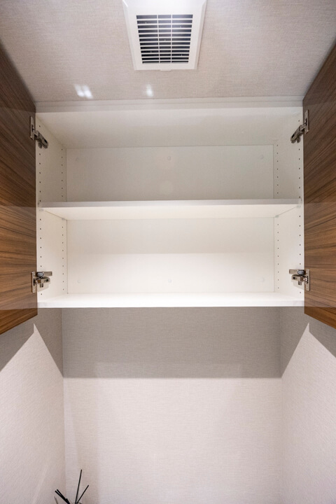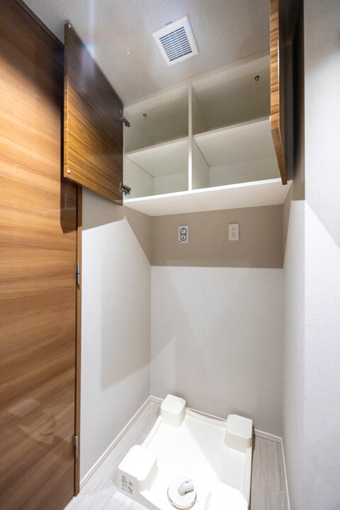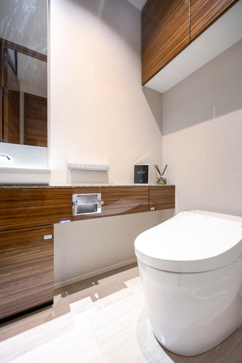 ウォシュレット一体型のトイレです。タンクレスタイプなのですっきりとした印象に。また、別途で手洗い器と鏡が造られているので、その場でサッと身だしなみを整えることができます。上部には吊戸棚が設置されていて、収納スペースもありますよ。カウンタースペースにはアロマなどを置いても◎。