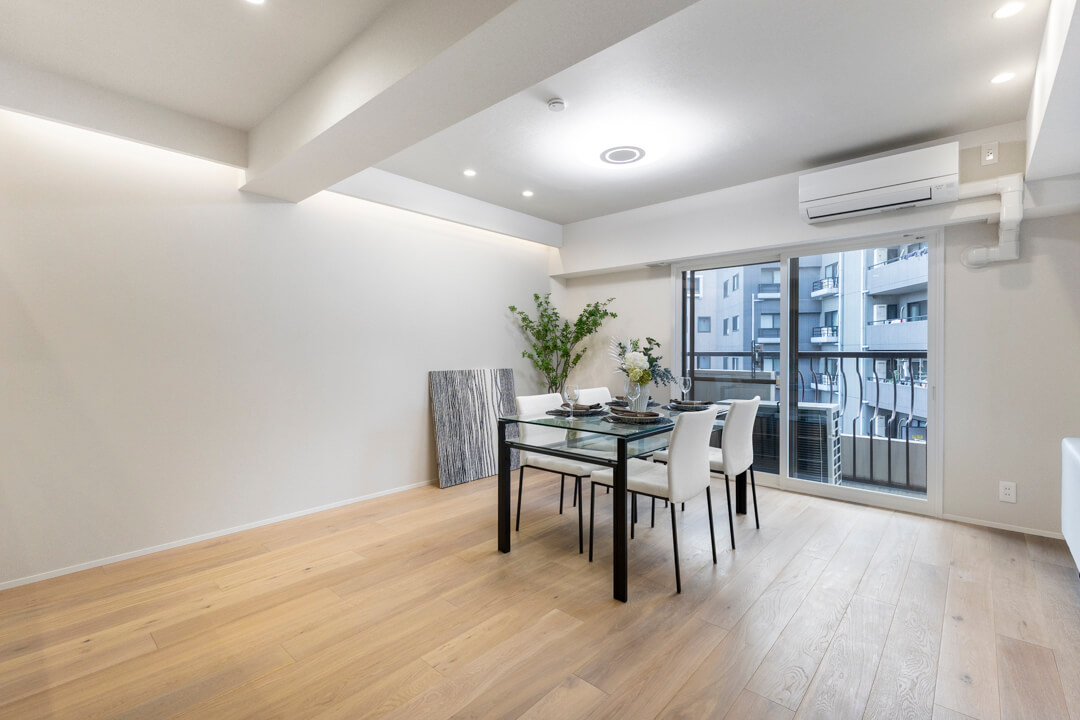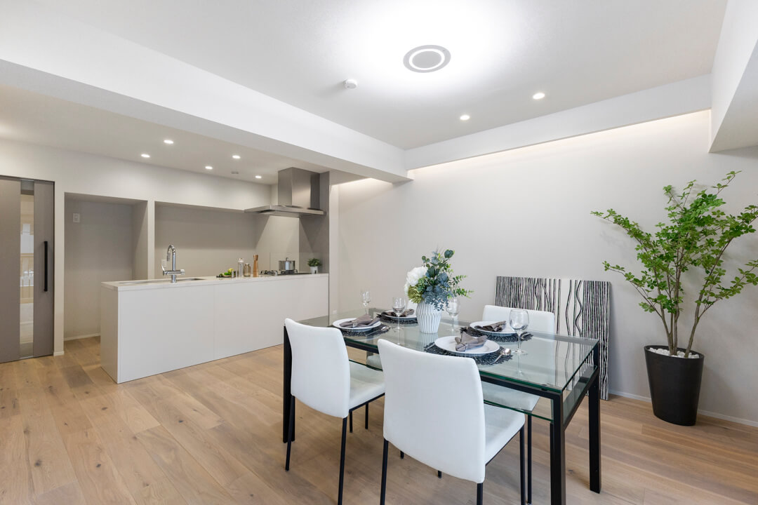 約14.8帖のLDK。白い壁紙&木目フローリングを採用したナチュラルな内装は、さまざまなテイストの家具と相性が良さそうです。間接照明の幻想的な明かりが洗練された印象をもたらします。