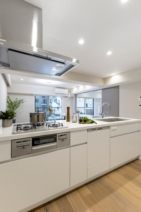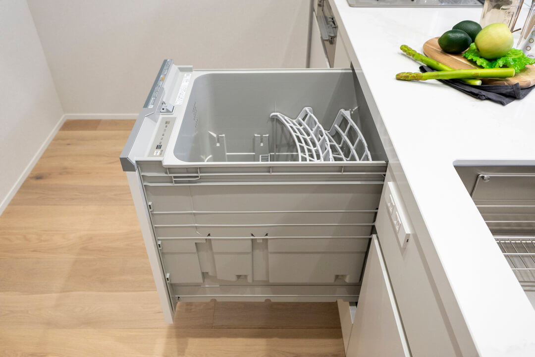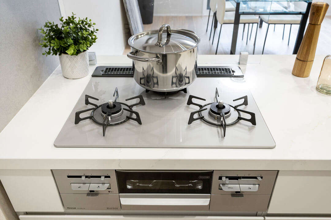 効率良く調理ができるグリル付3口ガスコンロを搭載。料理のレパートリーも増えそうです。さらに、食洗機が内蔵されているので、後片付けが捗り、節水効果も期待できます。