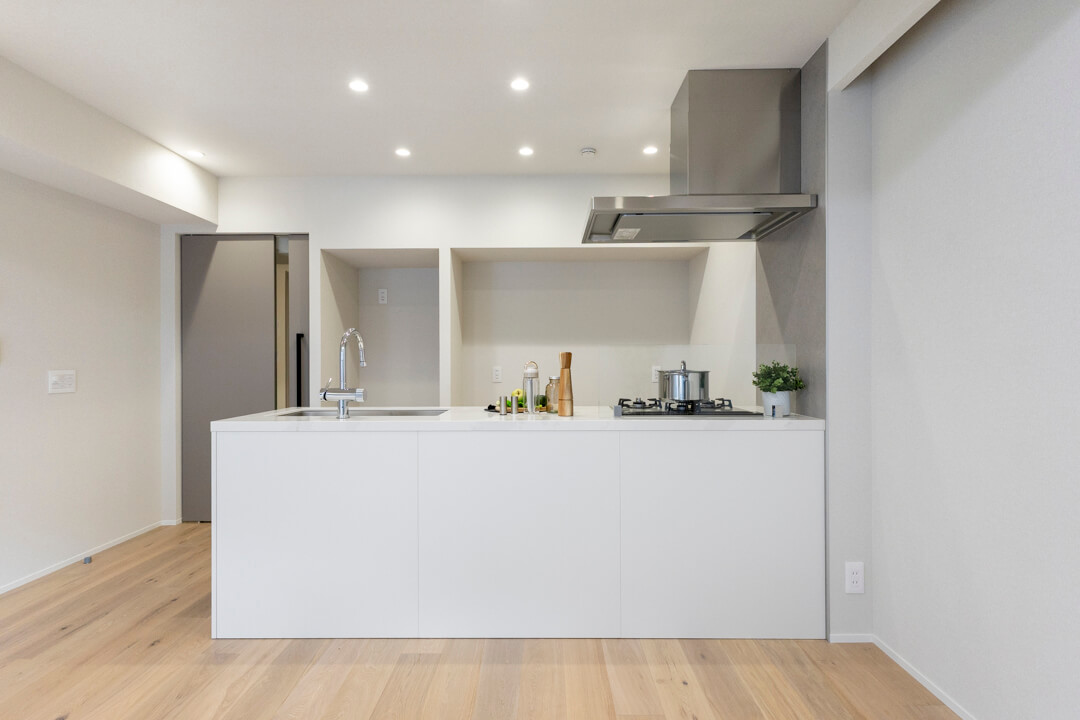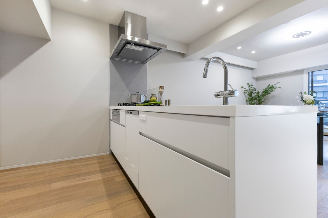 ホワイト基調で清潔感のあるキッチン。人気の対面型で、開放的な気分で調理ができます。家族の会話も弾みそうですね。コンロ前にはガラスガードが設置されているので、リビング側への油跳ねの心配はありません。