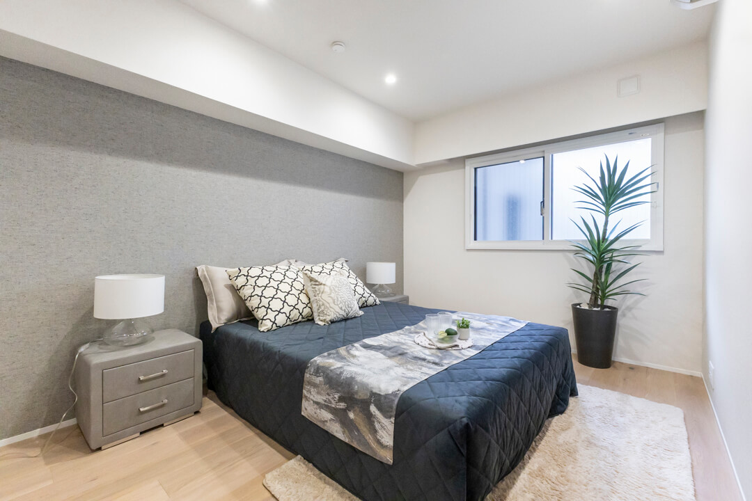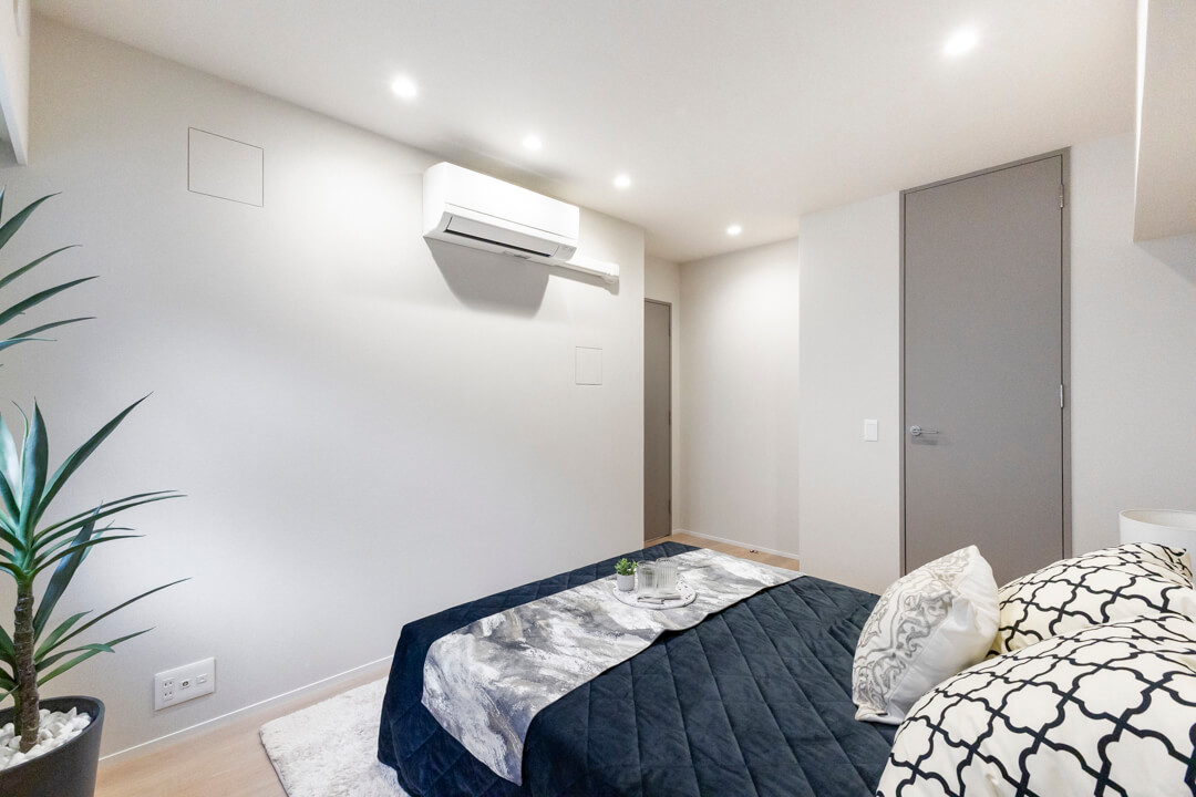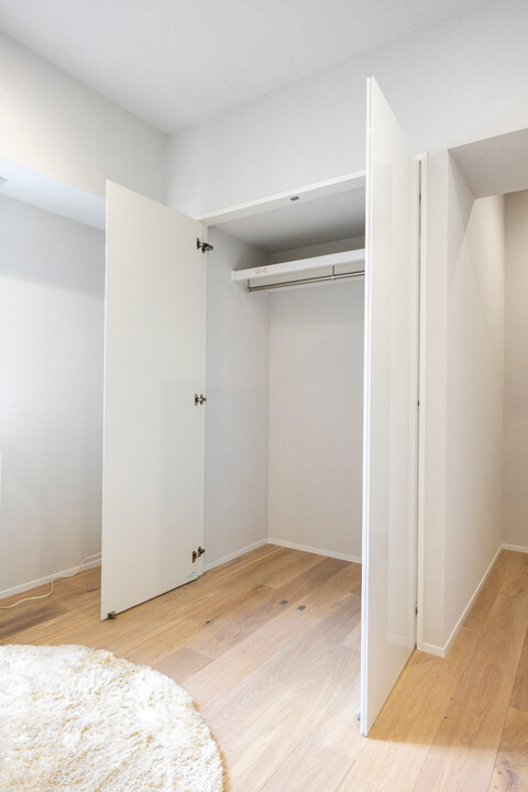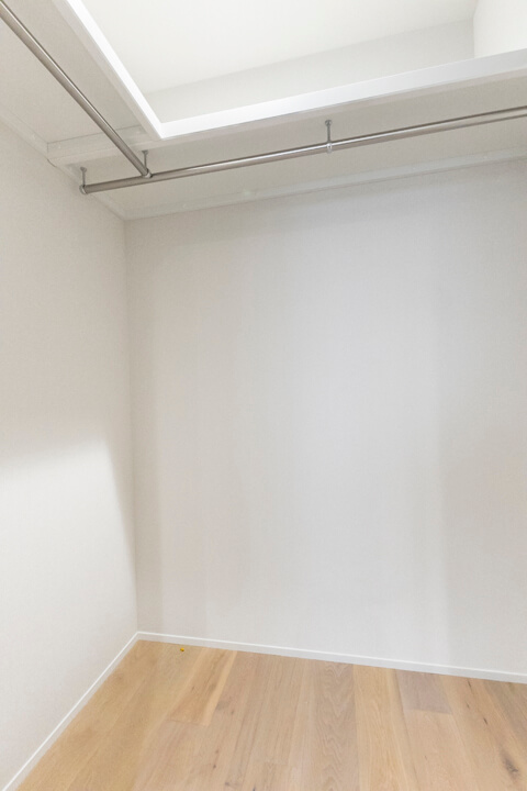 お隣にあるのは約6.6帖の洋室2。さりげないアクセントウォールが落ち着く雰囲気を演出します。リビングから最も離れた位置にあり、プライベート性の高い空間。WIC(ウォークインクローゼット)完備で収納豊富です。衣類はもちろん、トランクケースやゴルフバッグといった大きな荷物も収納でき、居室部分を広々と使うことができます。