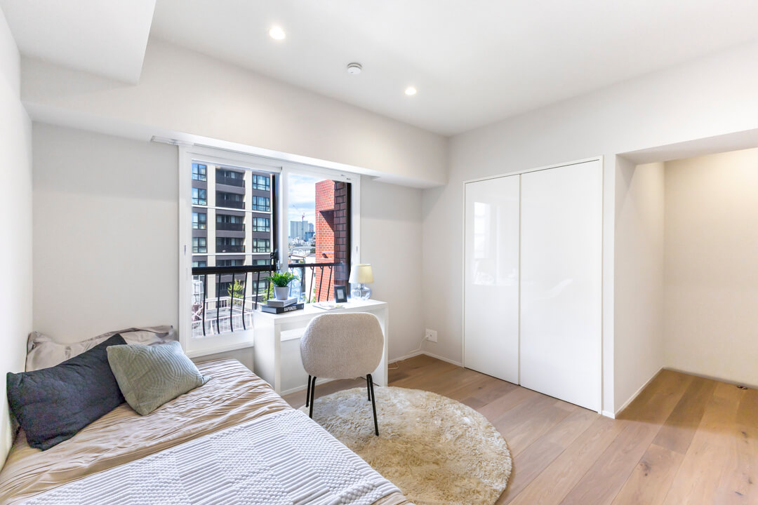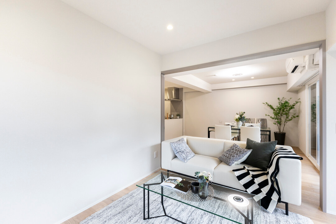 LDKに隣接する約5.5帖の洋室3。2面採光で日当たり・風通しの良い空間です。LDKとは引き戸で仕切られているので、ライフスタイルやシーンに合わせて使い分けることができます。写真のように拡張リビングにしたり、扉を閉めてワークスペースや趣味部屋にしたり。フレキシブルに活用してください。