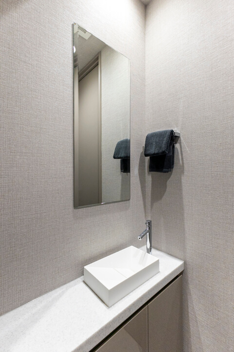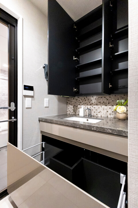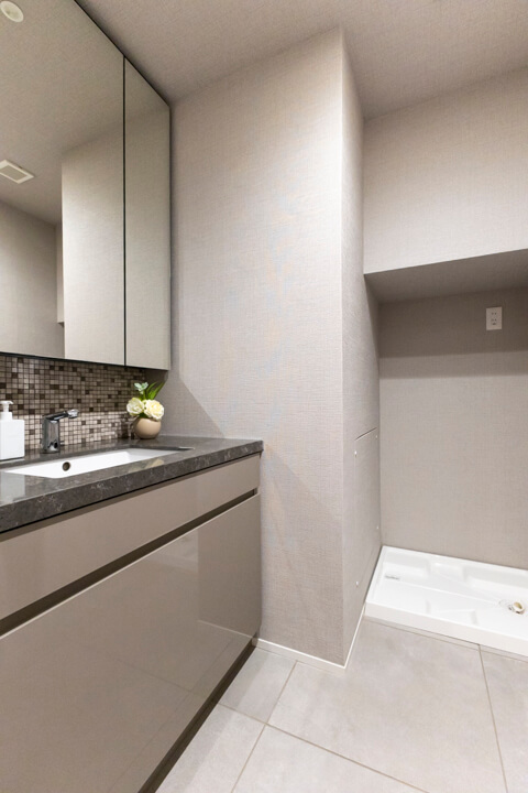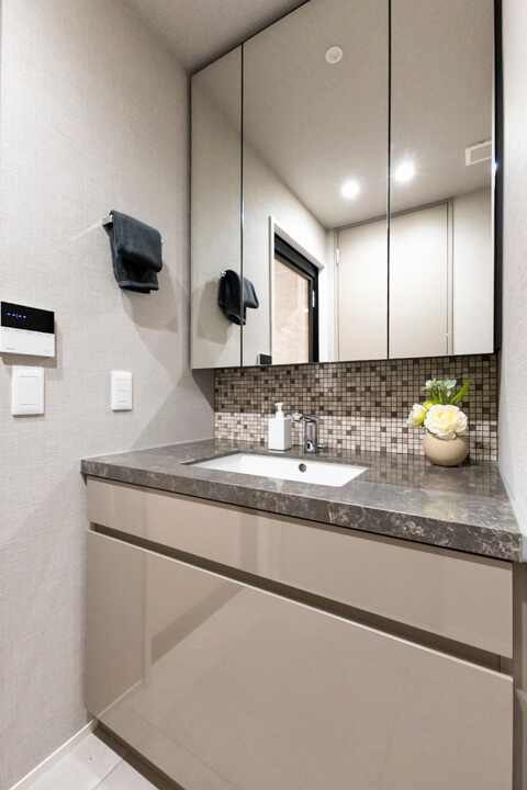 グレー基調で洗練された印象の洗面化粧台。大きな三面鏡付きで身だしなみを整えるのに便利です。鏡裏は収納棚になっていて、洗面まわりの小物をすっきり収納できますよ。足元にも引き出しが付いていて、いつも清潔な洗面室をキープできそうです。
