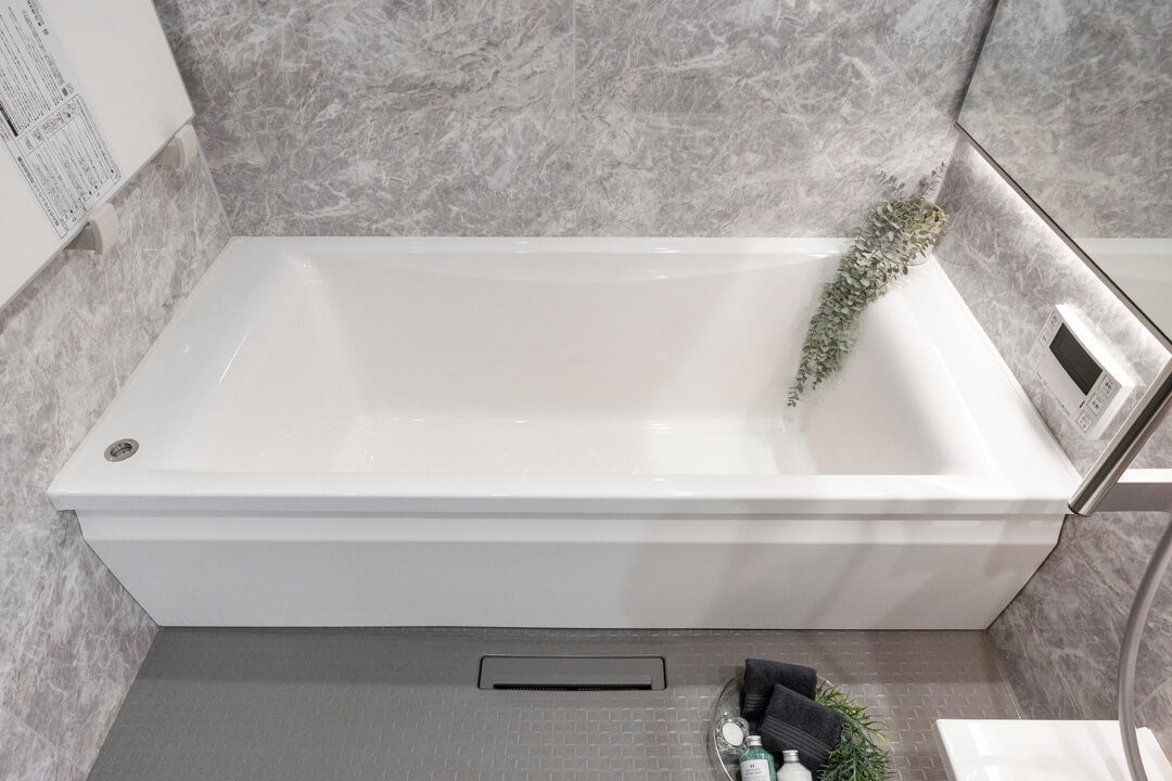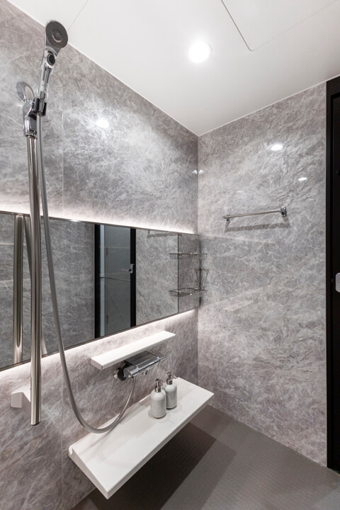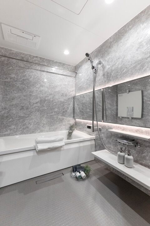 ワイドミラー&間接照明が高級感を演出するバスルーム。浴室換気乾燥暖房機・追い焚き機能搭載で1年中快適なバスタイムを過ごすことができます。家族の入浴時間がずれてしまった時、半身浴をしたい時も助かりますね。