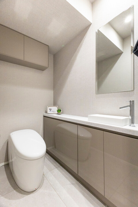 廊下に面していて独立性の高いレストルーム。TOTO製の洗浄便座付トイレに新規交換済みです。タンクレス仕様でスタイリッシュ。便フタは自動開閉式なので、直接触れることなく使用できて衛生的です。手洗いカウンター&吊戸棚も付いていて、使い勝手の良い空間です。