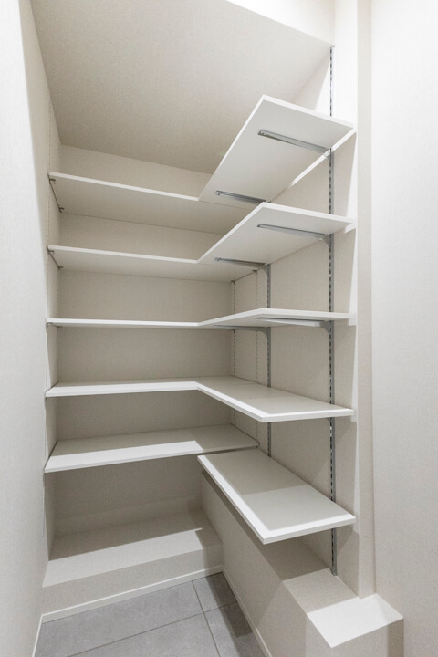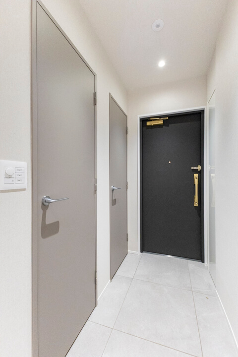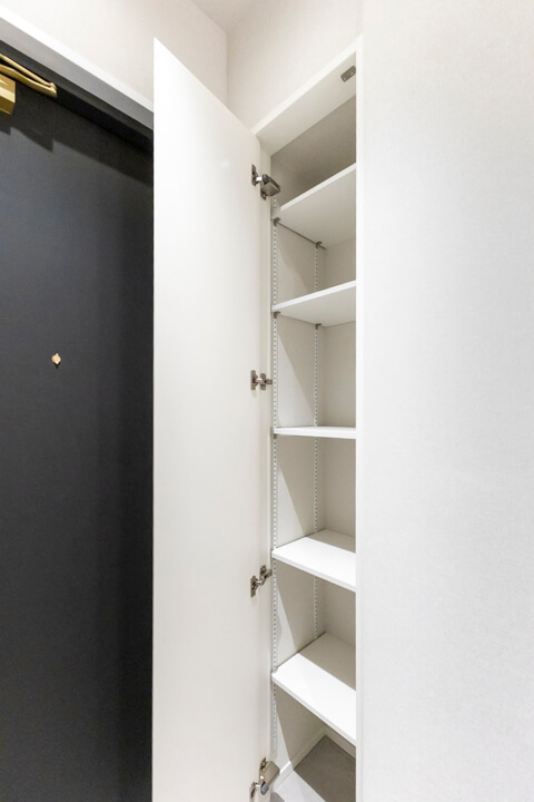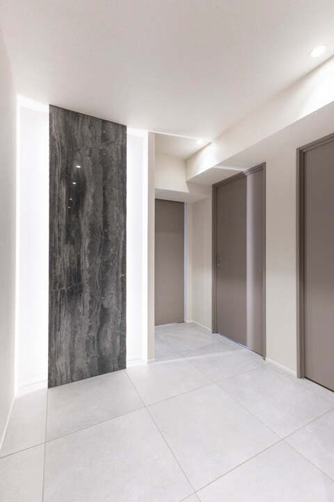 間接照明&アクセントウォールがホテルライクな雰囲気を演出する玄関ホール。SIC(シューズインクローゼット)&可動棚付きで収納性に優れています。ロングブーツやレインシューズ、傘なども収納でき、いつも清潔な玄関でお出迎えできそうです。