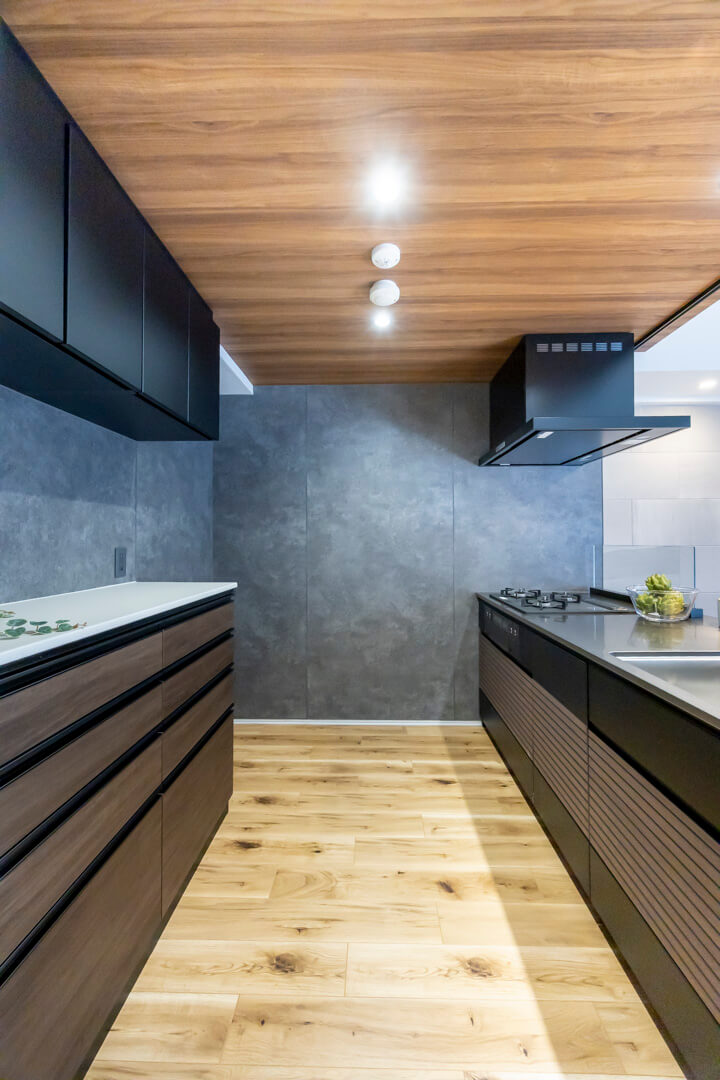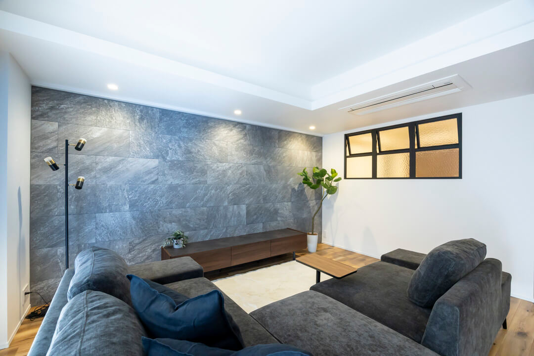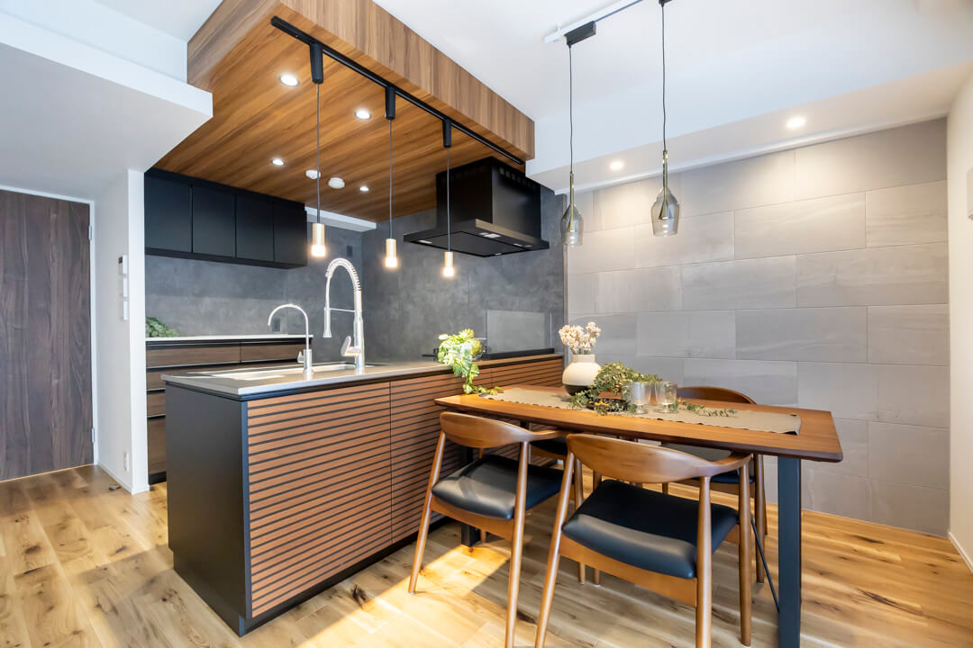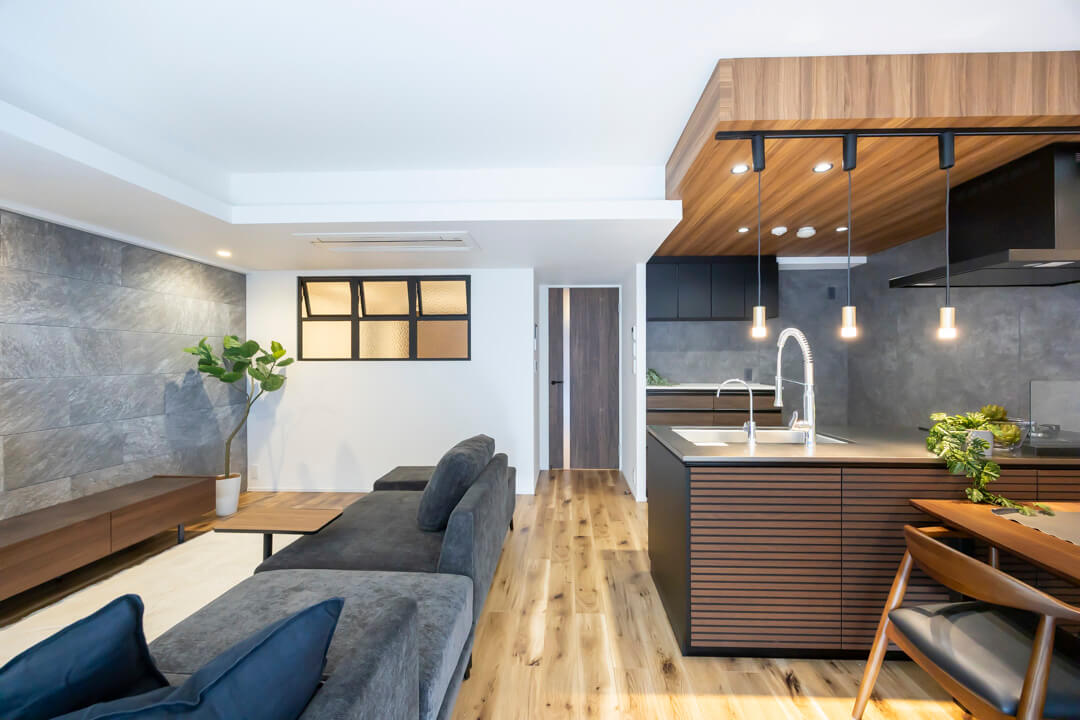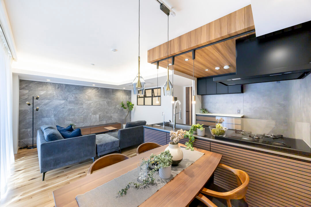 約17.0帖の広々としたリビングダイニングキッチンです。天井には間接照明があしらわれていて上品さをプラス。壁面にはグレートーンのアクセントウォールが設置されています。