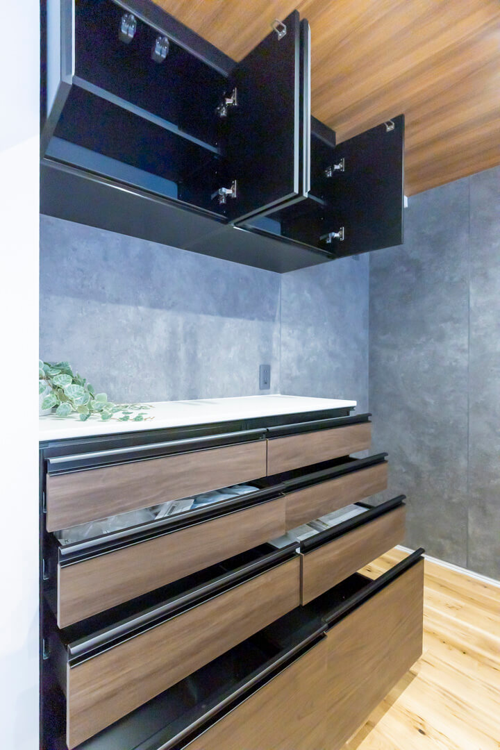 キッチンの背面側にはカップボードが備え付けられています。調味料や食器などを収納できるだけでなく、電子レンジなどを置くこともできるので便利です。