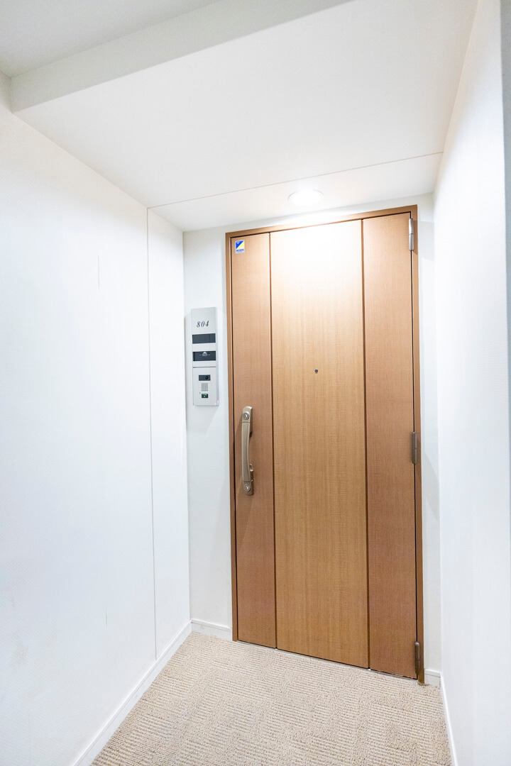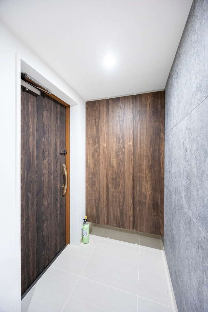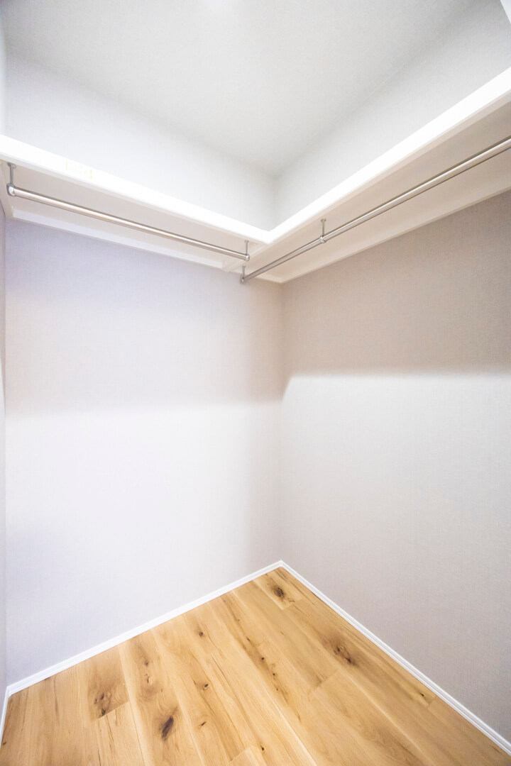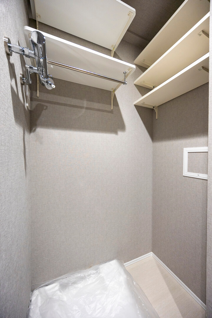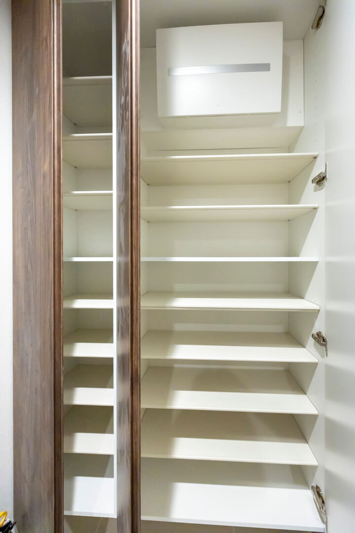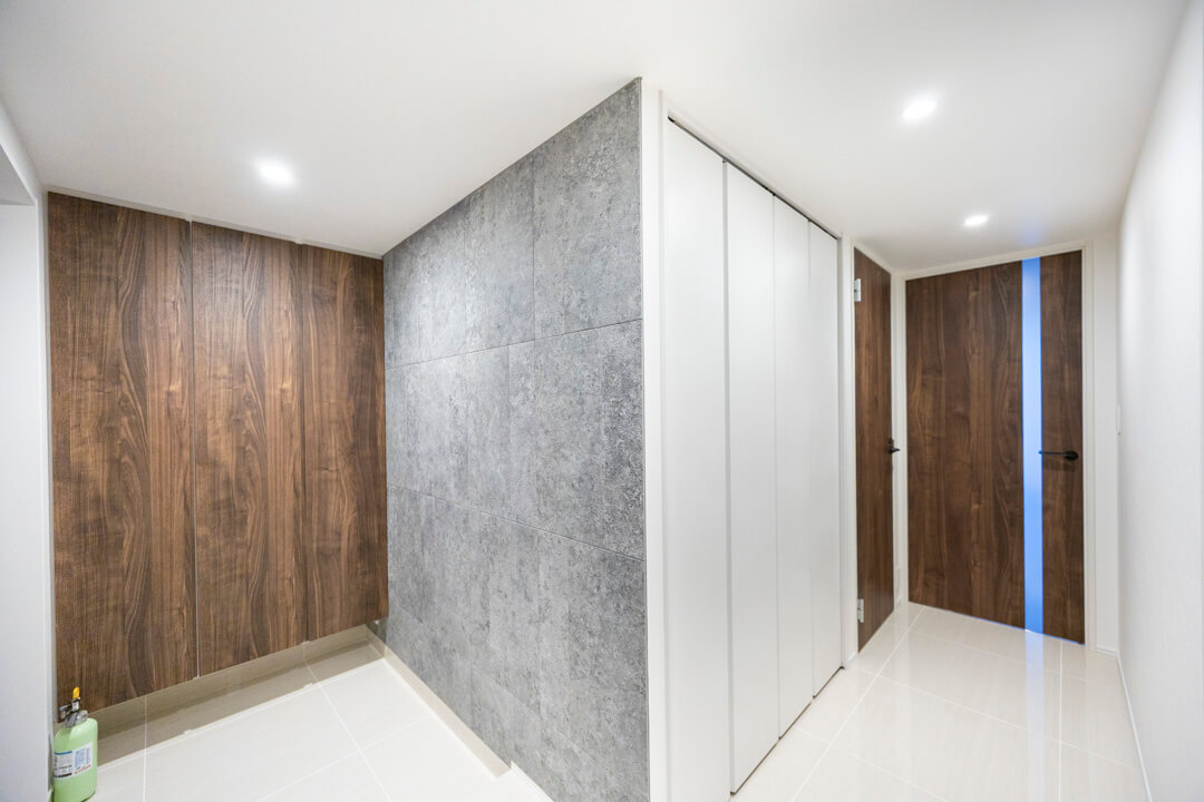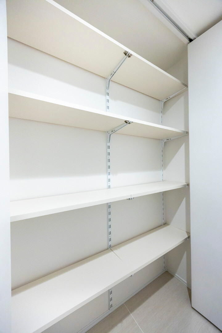 玄関入って左側にはシューズボックスが備え付けられています。高さがありますが、フロートタイプのため空間に圧迫感を与えません。また、廊下にも収納棚が造られており、生活感が出がちな小物をすっきりと収納できます。