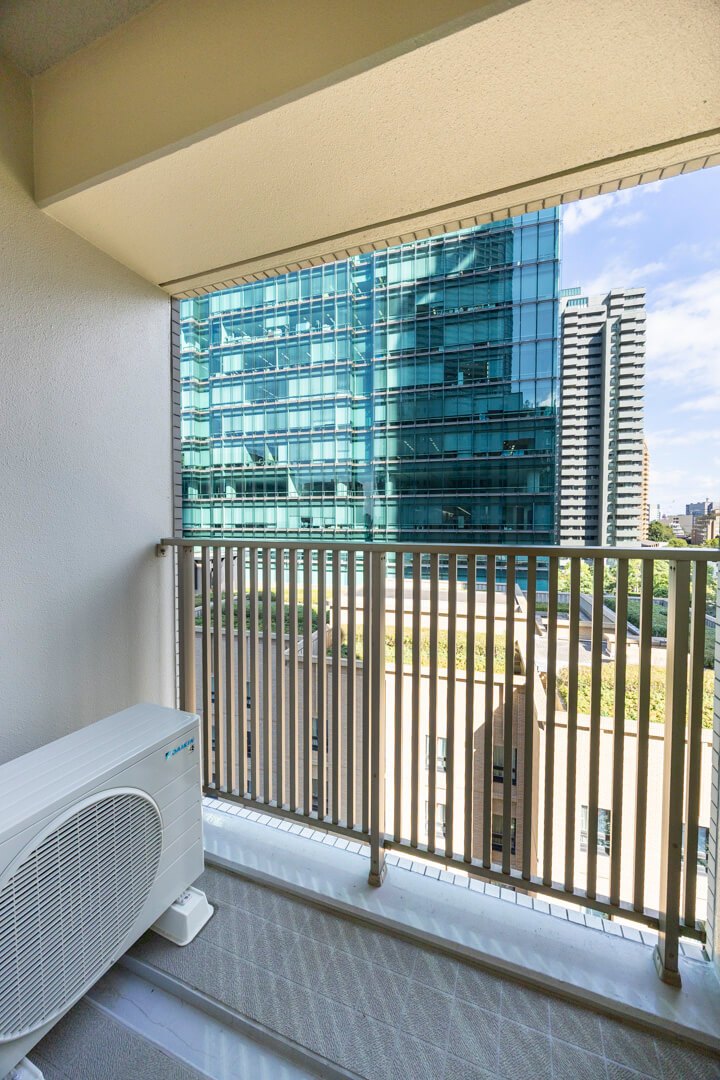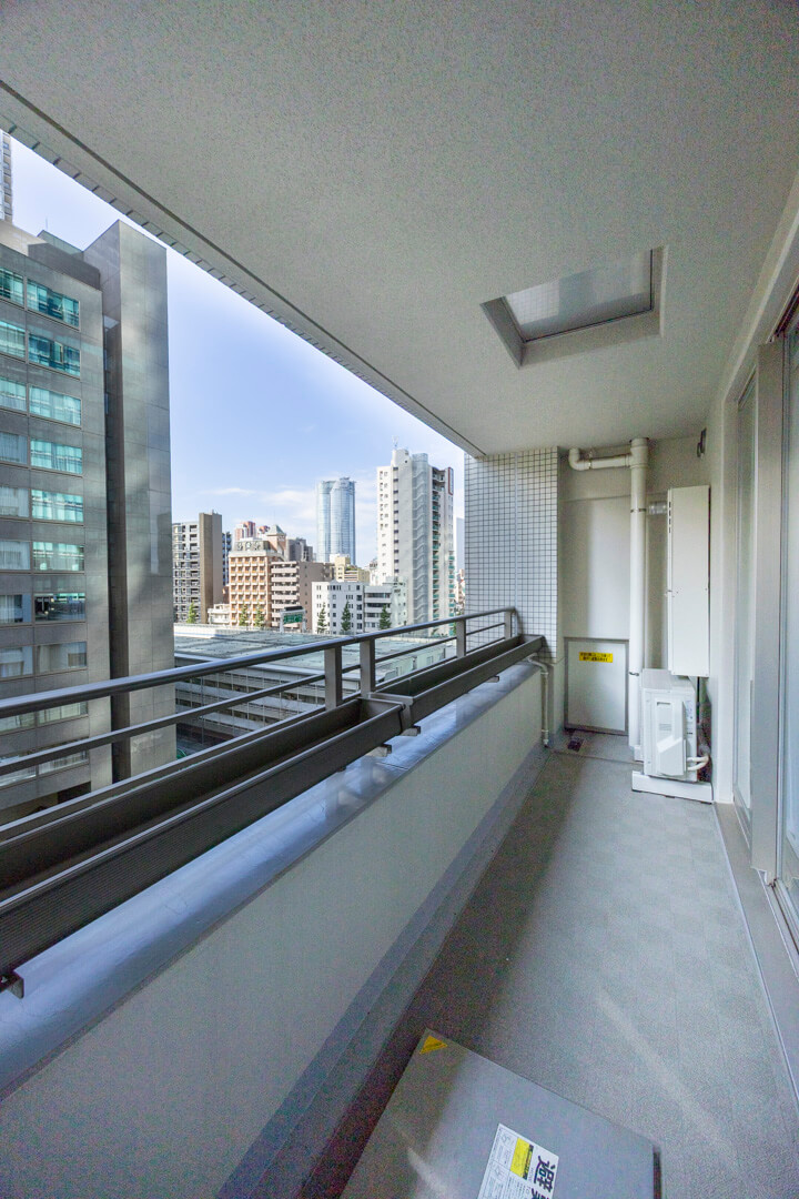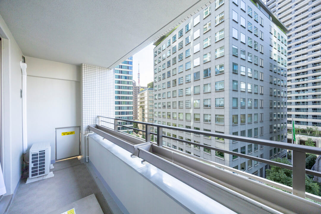 約8.29㎡のバルコニーは南西向きのため日当たりが良好です。目の前にはビル群を望む都会的な眺望が広がり、東京タワーも少し顔を覗かせています。