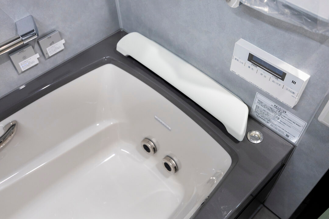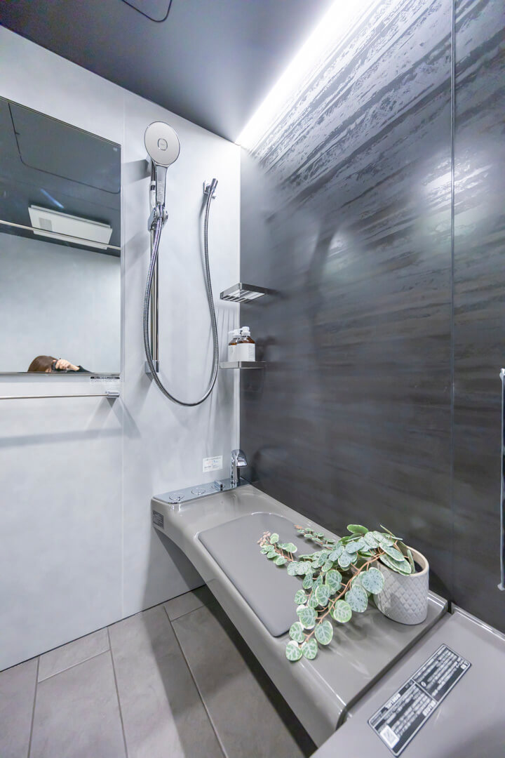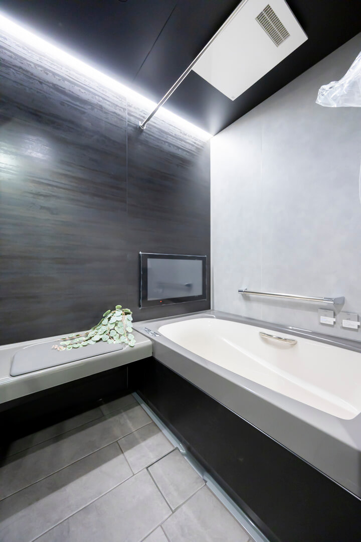 ダークトーンで重厚感のあるバスルームです。お風呂にゆっくり浸かるのが好きという方に嬉しい追い焚き機能を搭載。家族の入浴時間がずれてしまっても安心です。また、浴室乾燥機には暖房・乾燥・換気・涼風の機能がついており、一年中快適に過ごすことができます。また、浴槽側にテレビが付いているので、毎日のバスタイムがより充実した時間になりそうです。