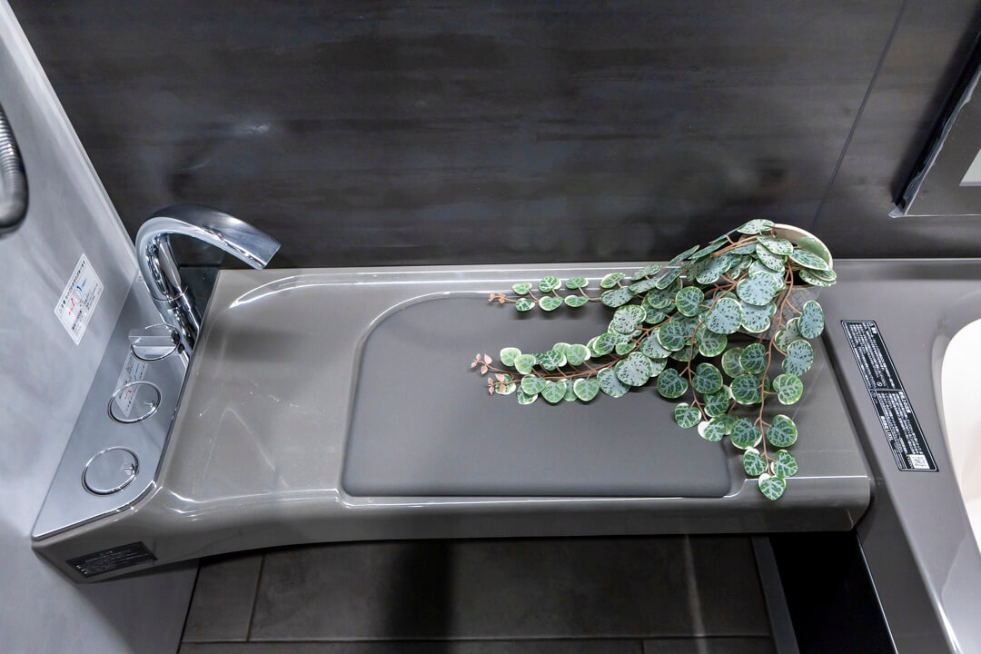 ヘッドレストにもたれながら映像を観たりすることもできます。肌をなでるお湯がやさしく身体をあたためてくれる「肩湯」に、心地よい刺激で腰まわりをほぐしてくれる「腰ほぐし湯」付き。日々の疲れを癒してくれる極上の時間になりそうですね。ベンチカウンターは半身浴の合間に休憩ができたり、足湯を楽しんだりすることができますよ。
