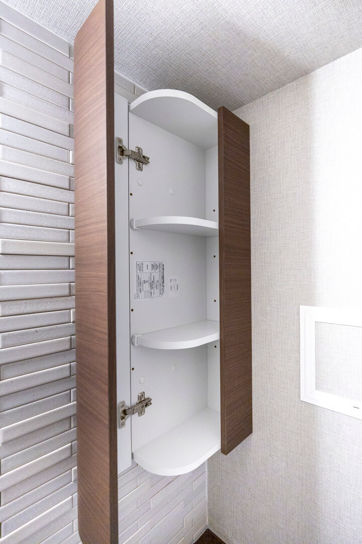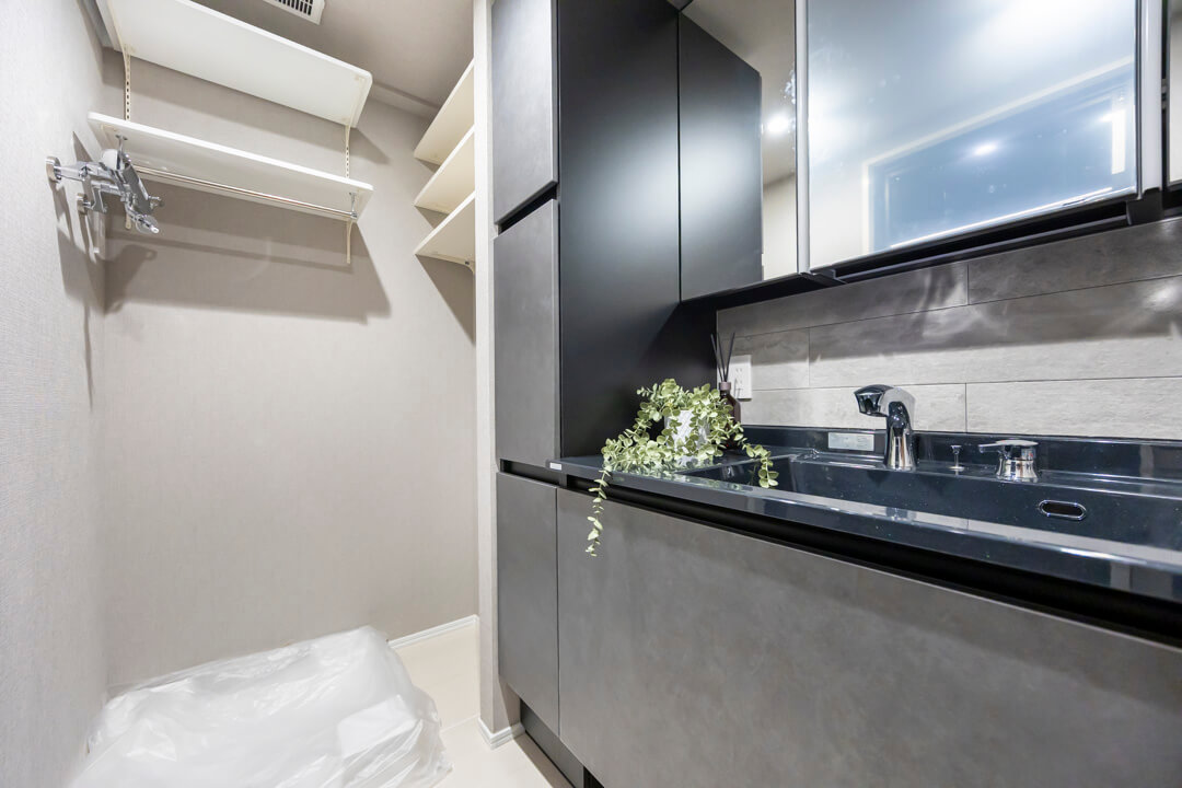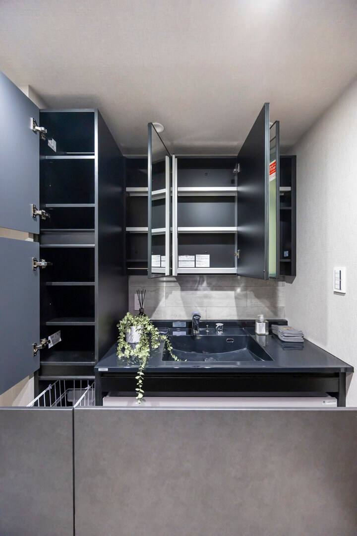 シックな印象でスタイリッシュな洗面化粧台です。三面鏡の中や引き出しなど収納スペースが豊富で、ごちゃごちゃしがちな洗面まわりもきちんと整頓させることができます。洗濯機置場にも可動棚が設置されていて便利。