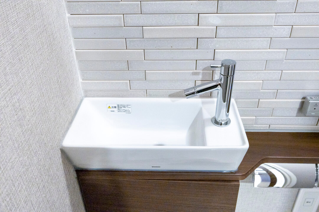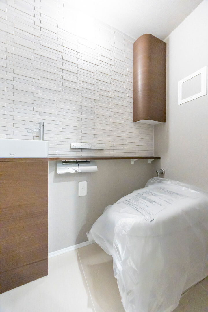 ウォシュレット一体型のトイレです。タンクレスタイプなのですっきりとした印象に。また、別途で手洗い器が造られているので、すぐに手を洗うことができて衛生的です。背面側には棚が設置されていて、収納スペースもありますよ。カウンタースペースにはアロマなどを置いても◎。