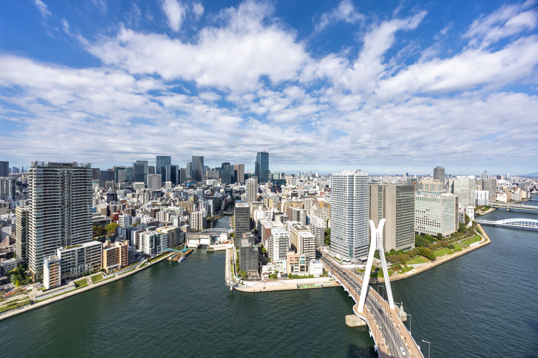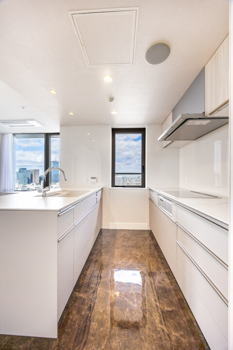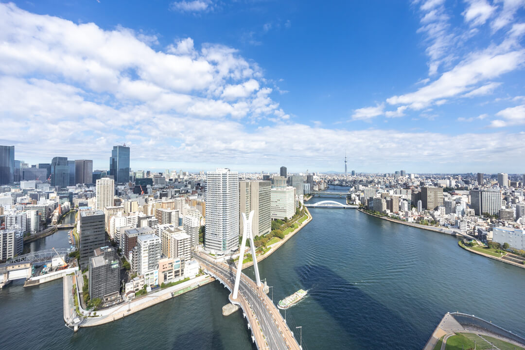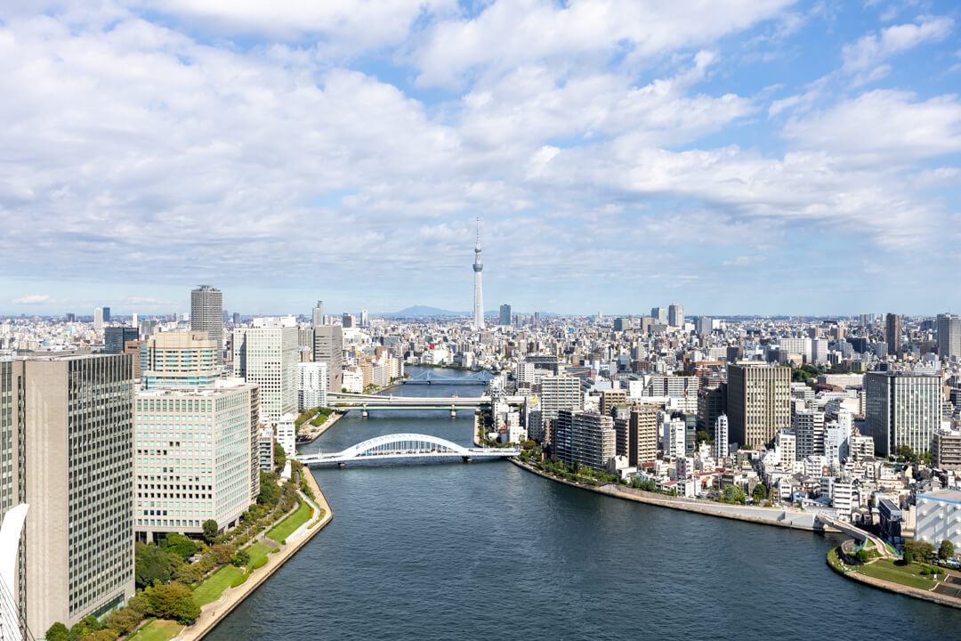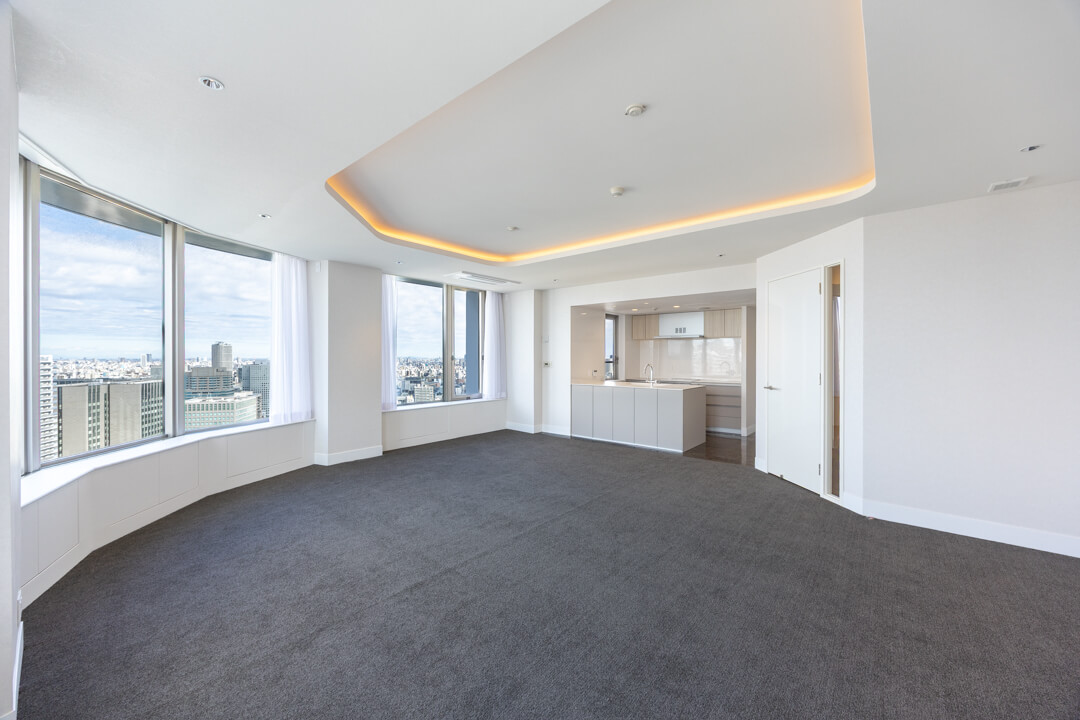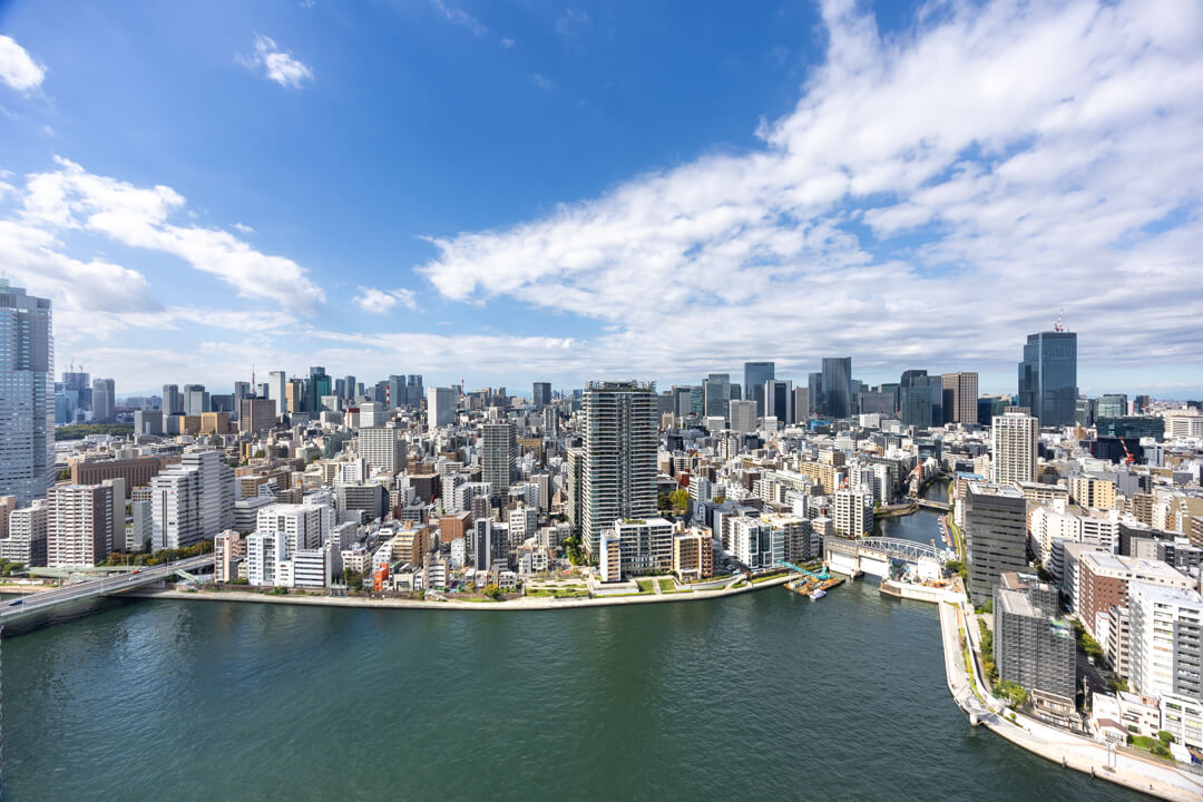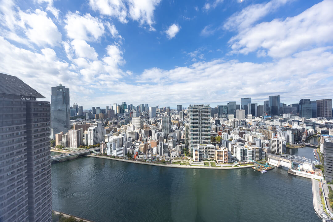 約31.9帖の広々としたリビングダイニングキッチンです。窓に囲まれており、そこからは隅田川の水の潤いを感じる眺望が広がっています。東京スカイツリーや東京タワーも望め、夜景も堪能できそうですよ。