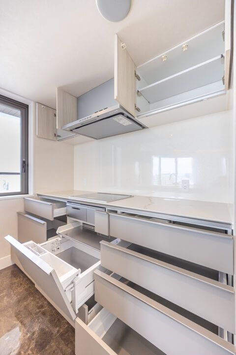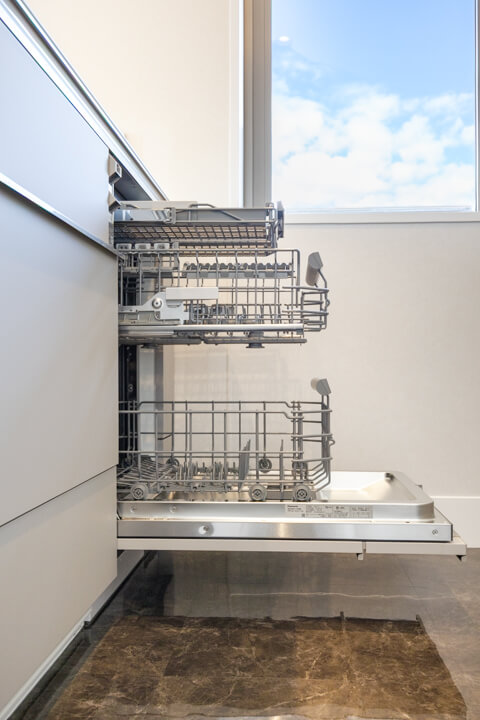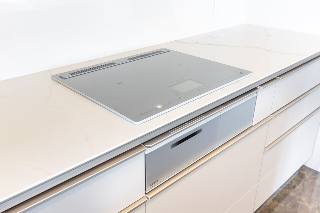 3口IHクッキングヒーター、グリル、Panasonic製の大型食洗機付きと設備面も充実しています。シンクも広々としているので野菜などが洗いやすそうですよ。