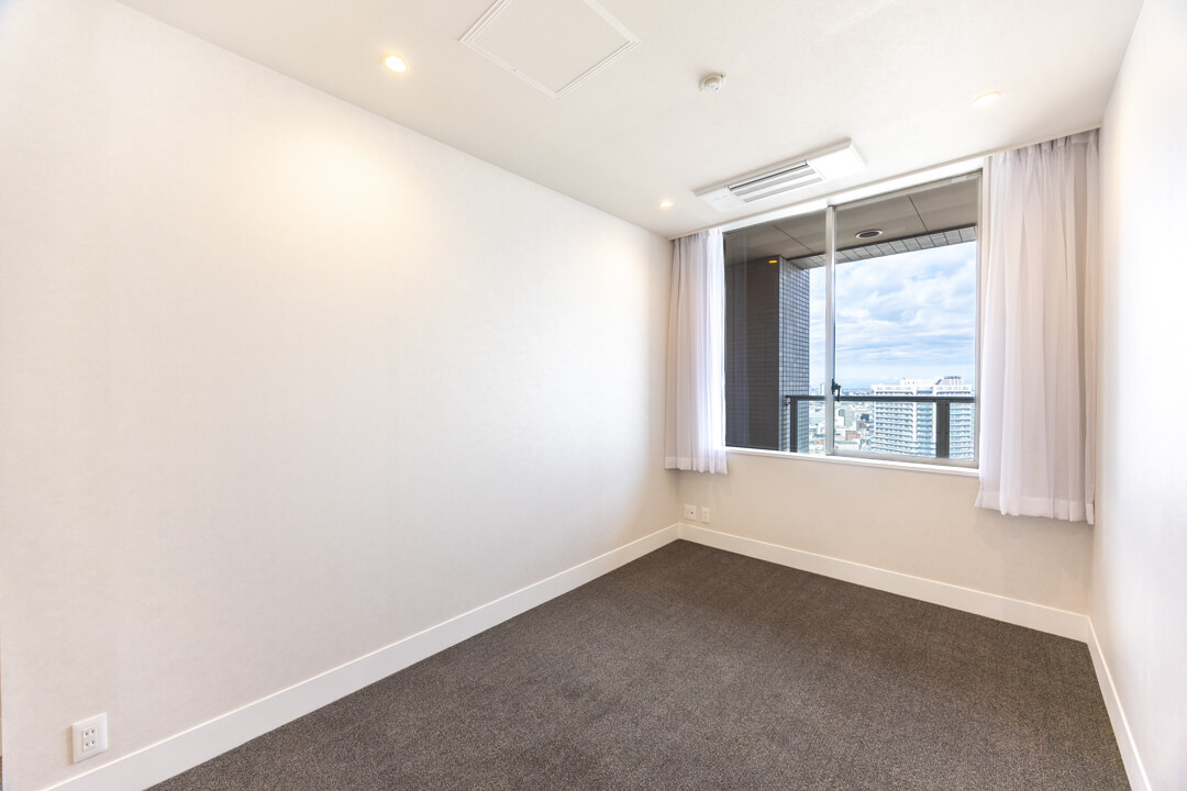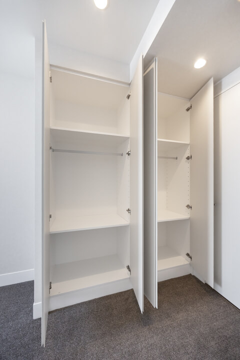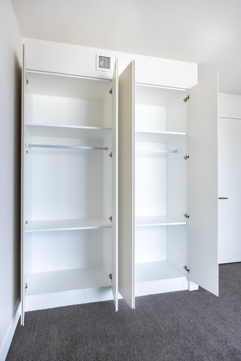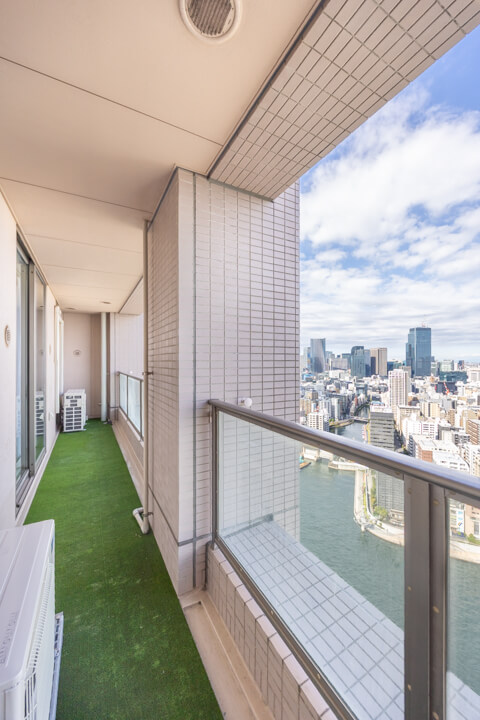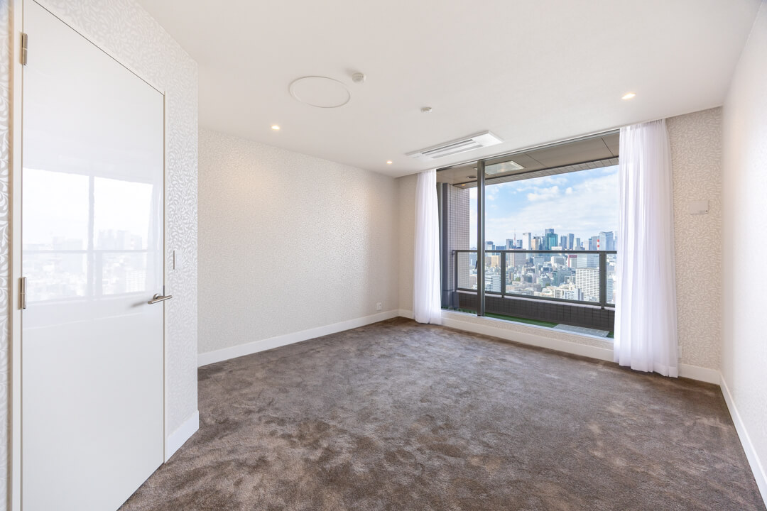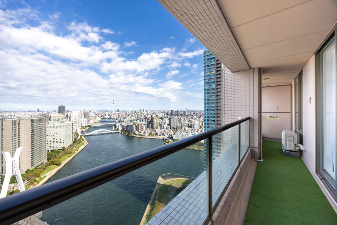約7.7帖の寝室3は独立性があって子ども部屋に良さそうな空間です。パイプハンガーや棚板が設置してあって便利なクローゼット付き。窓からは東側のバルコニーにアクセスができます。ゆとりのあるバルコニーからは、隅田川や東京スカイツリーが望め、昼間は水面に光がきらめき、夜にはライトアップされたスカイツリーが幻想的な雰囲気を演出します。
