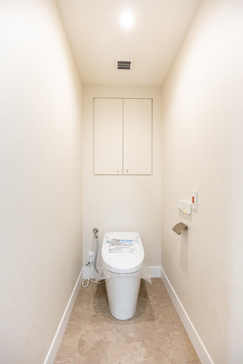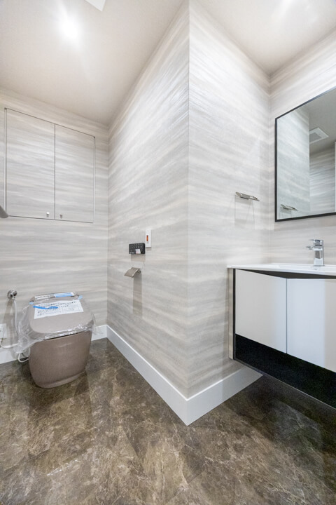 玄関側にもトイレが造られています。ウォシュレット一体型のトイレです。タンクレスタイプなのですっきりとした印象に。また、別途で手洗い器と鏡が設置されているので、その場でサッと身だしなみを整えることができます。