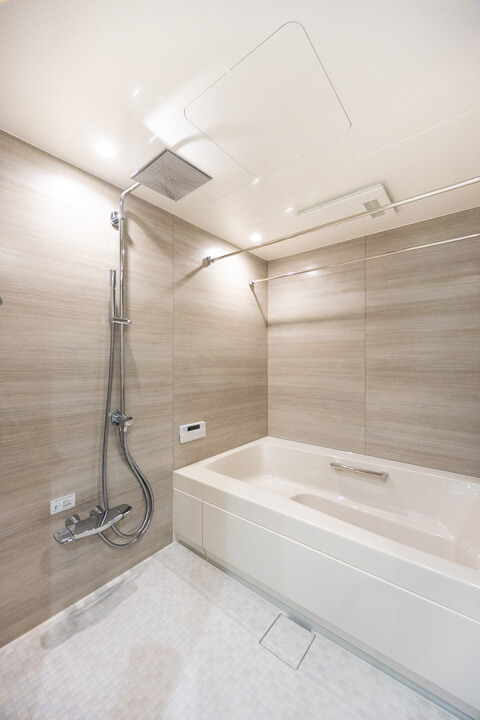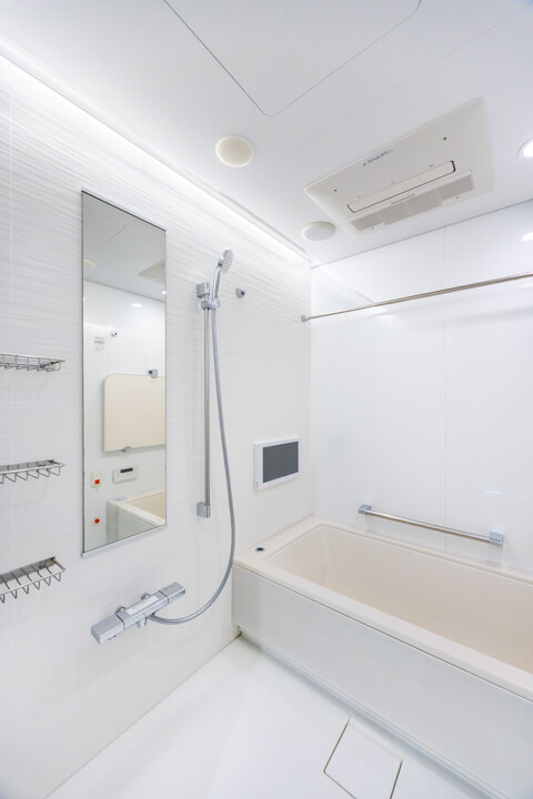 1416サイズのバスルームには、お風呂にゆっくり浸かるのが好きという方に嬉しい追い焚き機能を搭載。家族の入浴時間がずれてしまっても安心です。浴室乾燥機には暖房・乾燥・換気・ミストサウナの機能がついており、一年中快適に過ごすことができます。また、浴槽側にテレビが付いているので、毎日のバスタイムがより充実した時間になりそうです。