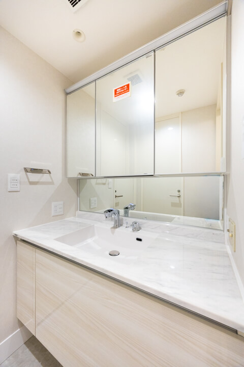 三面鏡の中に化粧品などが収納できて使い勝手良好な洗面化粧台です。カウンターと洗面ボウルには継ぎ目がないので、お手入れも簡単。