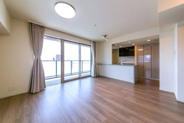 キッチンスペースを含め、約18.0帖のLDK。南西・南東向きの2面採光で日当たり良好。窓面積も広く開放感がたっぷりと感じられます。