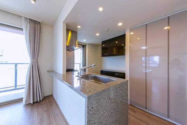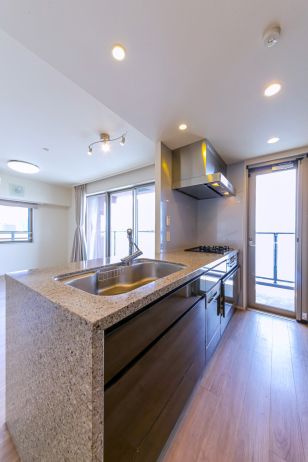 家族やゲストと会話が弾む対面型のシステムキッチン。小さなお子さんがいるご家庭では子どもの姿を見守れます。料理が捗る3口ガスコンロ、家事の時短に心強い食洗機付き。カップボードとパントリーも備わっていて収納スペースもしっかりと確保されています。勝手口からバルコニーへの出入りも可能です。