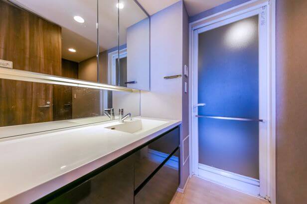 カウンタースペースが広々使える洗面化粧台。ミラーボックス、洗面下キャビネット、リネン庫付きで収納スペースが充実。いつでも整った状態をキープできそうですね。