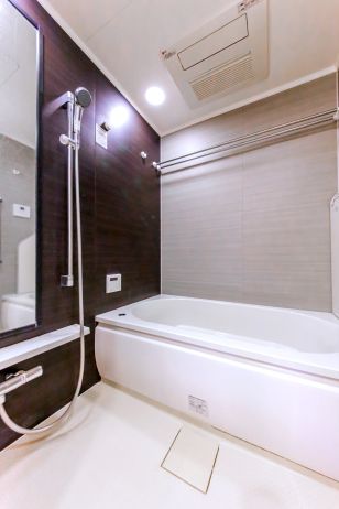 1418サイズのバスルーム。追い炊き機能の他、浴室換気乾燥機とランドリーパイプ付きで雨の日や冬場の洗濯にも困りません。