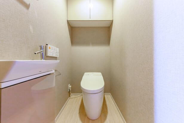 廊下に面したレストルーム。空間がすっきり見えるタンクレストイレです。独立型の手洗い器、収納スペース、ウォシュレットも備わっています。