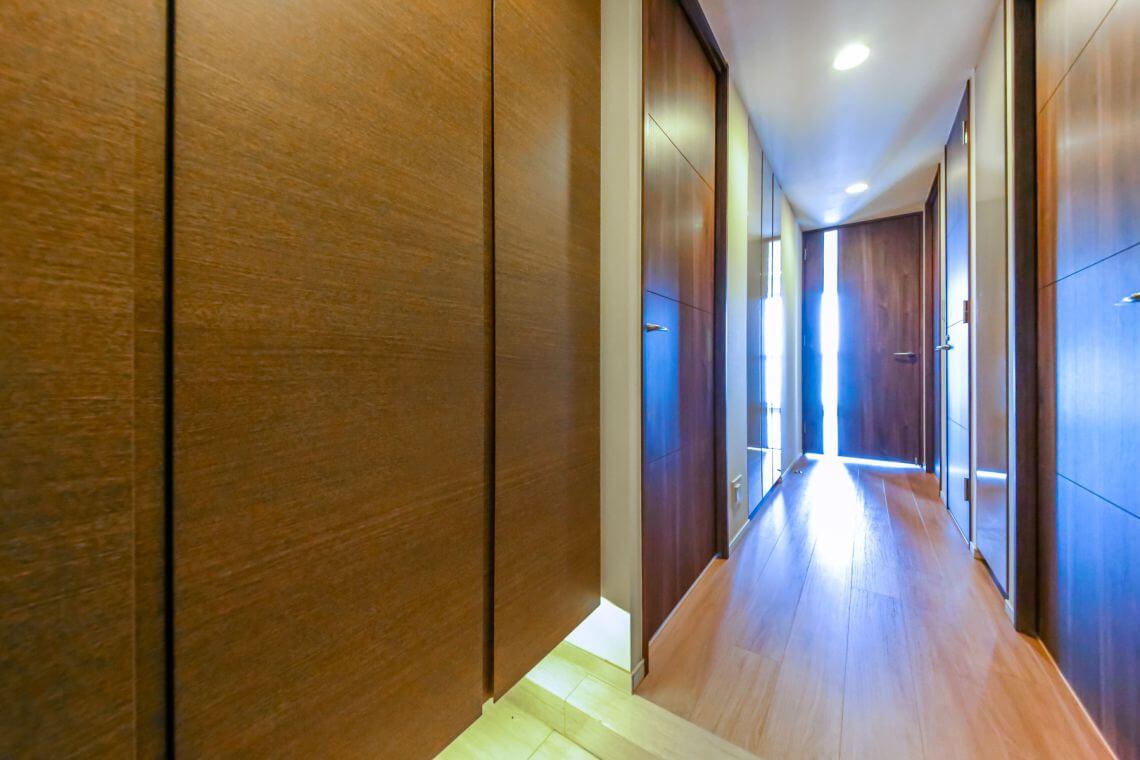 玄関にはシューズボックスを完備。足元をやさしい光で照らしてくれるフットライト付です。また、廊下にも物入が2ヵ所備わっており、収納スペースが充実しています。