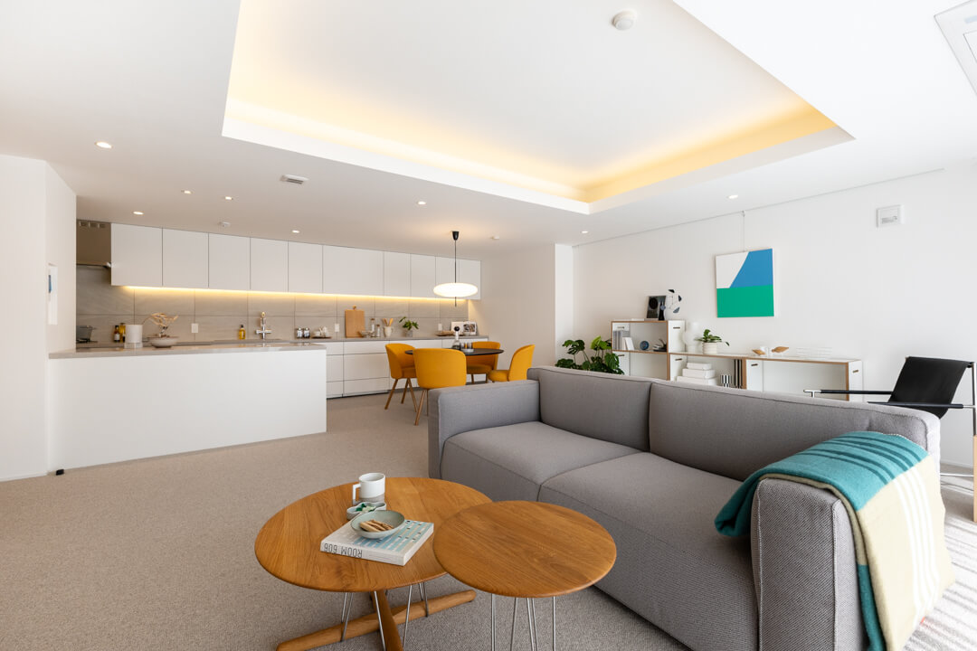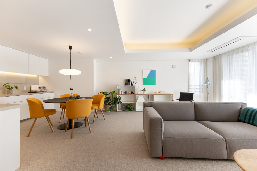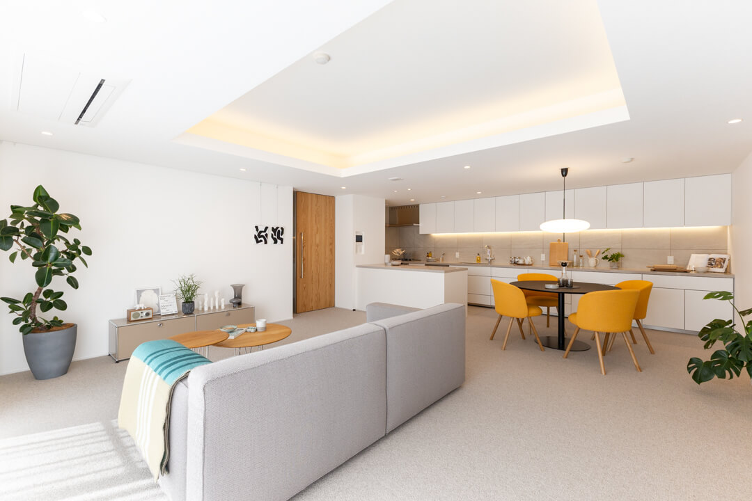 開放感溢れる約28.0帖のLDK。南向きの大きな窓からあたたかい太陽光がたっぷり降り注ぎます。折り上げ天井やビルトインエアコンが奥行きをもたらし、間接照明のやわらかな明かりでアクセントを。温かさと洗練された雰囲気を兼ね備えた内装が魅力的です。ピクチャーレールを活用し、自分好みの空間づくりをお楽しみください。