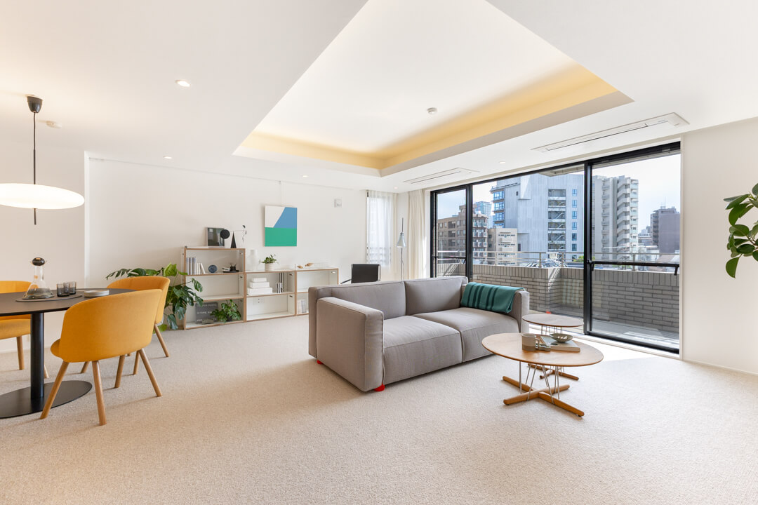フロアはふかふかとしたカーペット貼り。床暖房付きなので、寒い時期も足元からじんわりと温まることができます。素足で心地よく、開放的に過ごせそうですね。滑りづらく、直接床に座りやすいので、小さなお子さまがいても安心です。