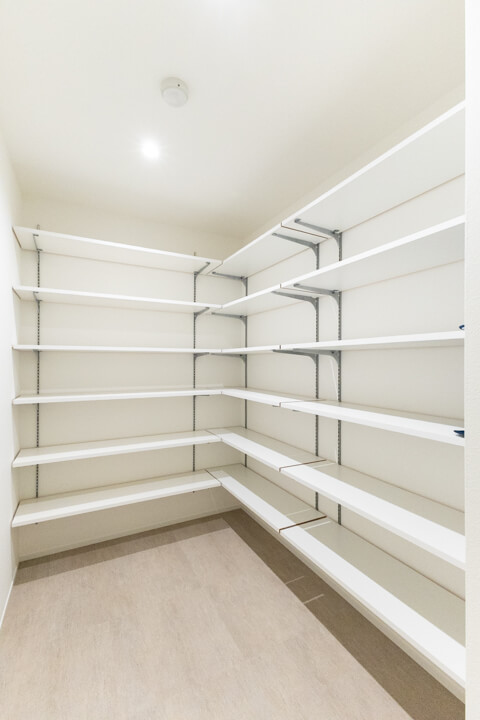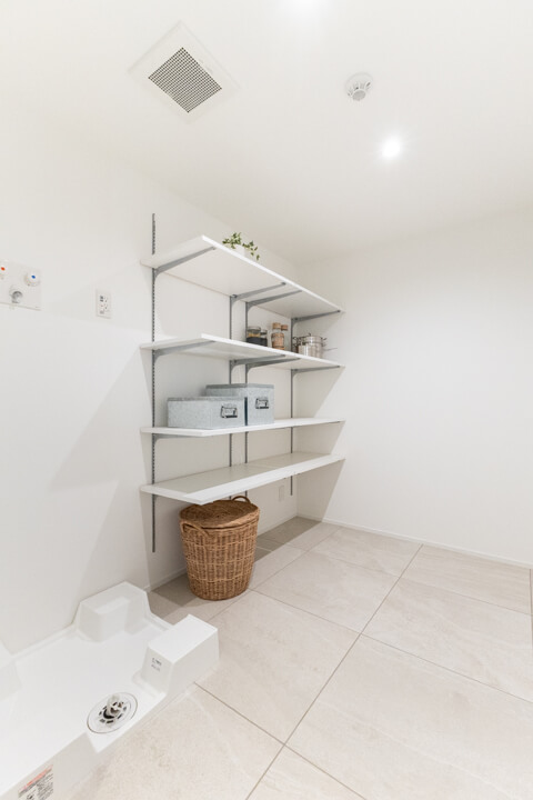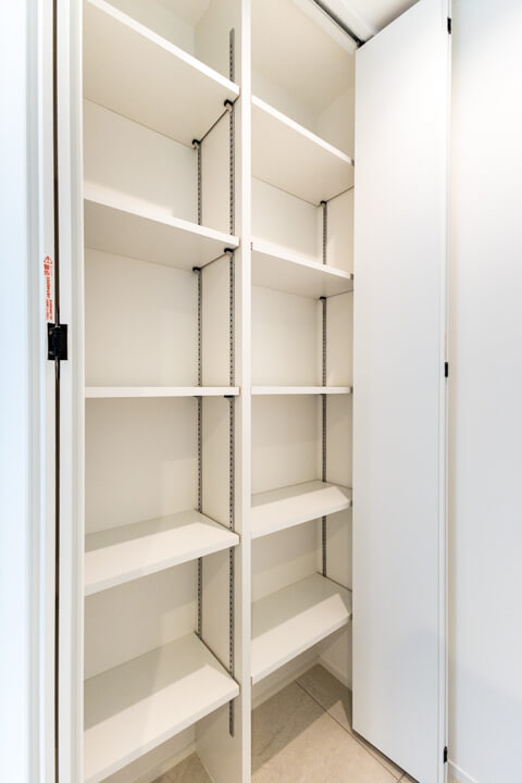キッチン奥には、廊下からもアクセスできるパントリー兼ランドリールームが。約2.9帖の空間です。自由度の高い可動棚付きで、冷蔵庫もこちらに設置できます。生活感が出る部分を目隠しできるのが嬉しいですね。回遊性の高い動線で、家事効率が上がりそうです。