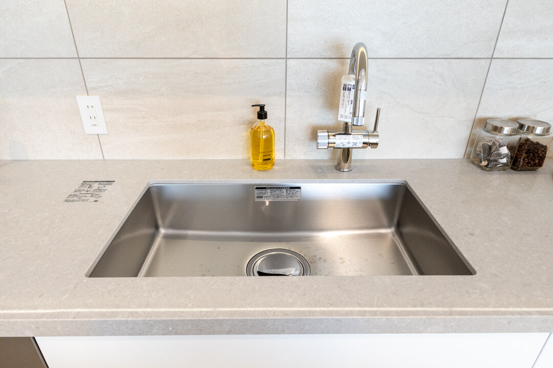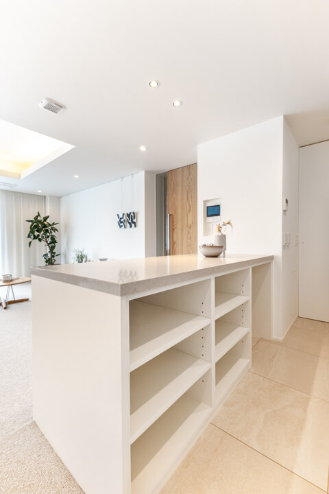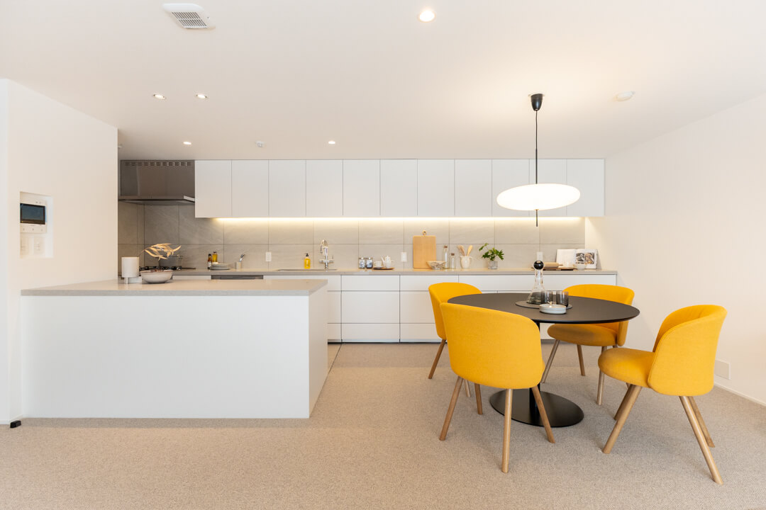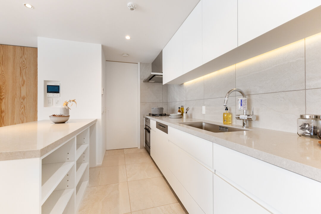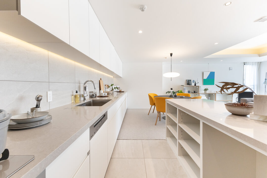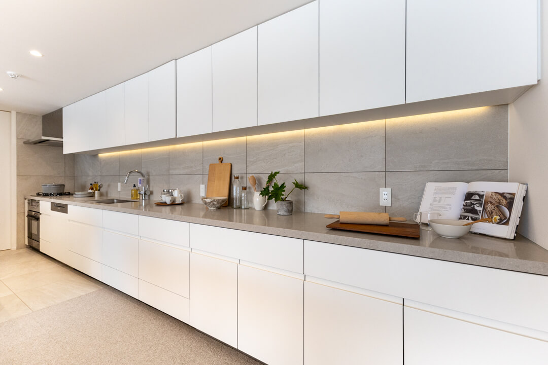 壁に沿って設置されたワイドカウンターが印象的なキッチン。調理台としてはもちろん、インテリアスペースとしても活用できます。複数人での調理も快適に行うことができ、家族のコミュニケーションの場になりそうですね。リビング同様、床暖房が敷設されているのも嬉しいポイントです。