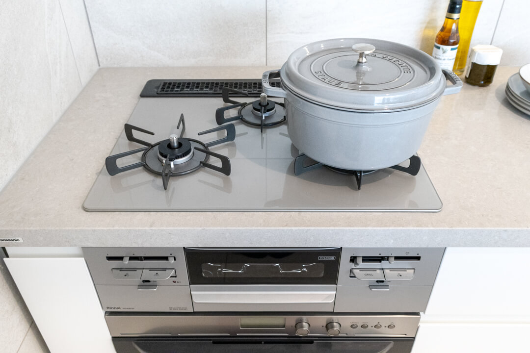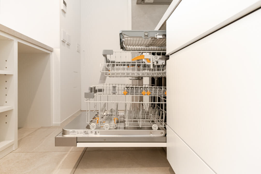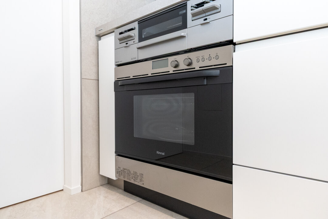 グリル付3口ガスコンロ・浄水器付シャワー水栓完備で調理効率UP。さらに、電子レンジとガスオーブンが一台になった電子コンベックを内蔵しています。火の通りにくい肉料理なども調理しやすく、料理のレパートリーが増えそうですね。容量の大きさが魅力的なMiele(ミーレ)製の食洗機も完備していて、後片付けの時短が叶います。