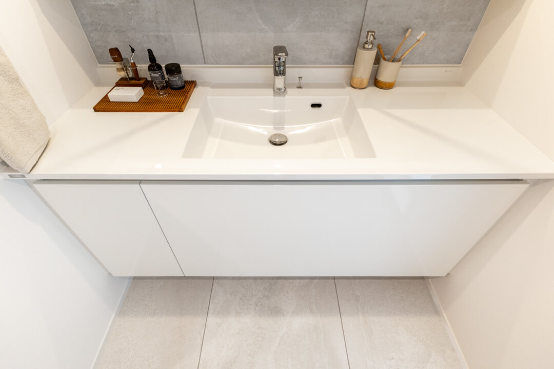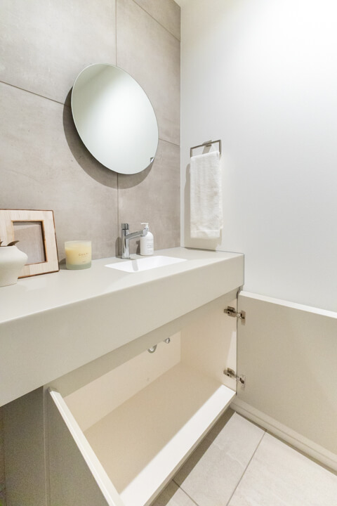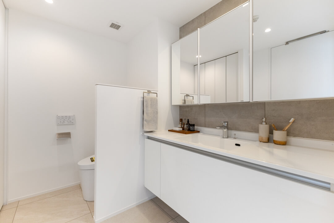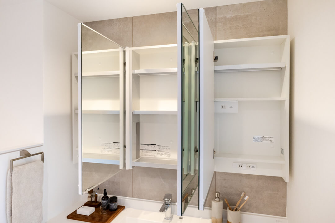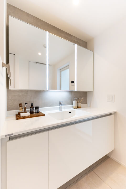 白基調で清潔感のある洗面化粧台。石目調のアクセントウォールが洗練された印象を醸し出します。カウンタースペースにゆとりがあり、化粧品やドライヤーの仮置きが可能。大きな三面鏡にはタテ型の2本のLED照明が入っていて、顔全体をしっかり照らしてくれます。顔に影ができにくく、お化粧がしやすいですね。