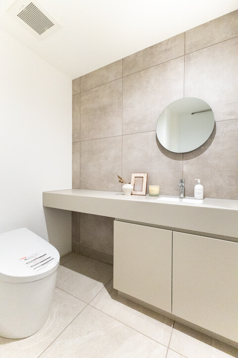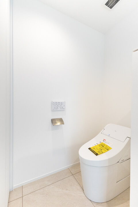 トイレは2ヶ所にあります。洗面室内にあるトイレは、プライベート用として家族で使用すると良いですね。大容量の収納付きなのが嬉しいポイントです。もう1つは廊下に面していて独立性の高い空間。手洗いカウンター付きですぐに手を洗うことができ、ゲストを洗面室まで案内する手間もかかりません。