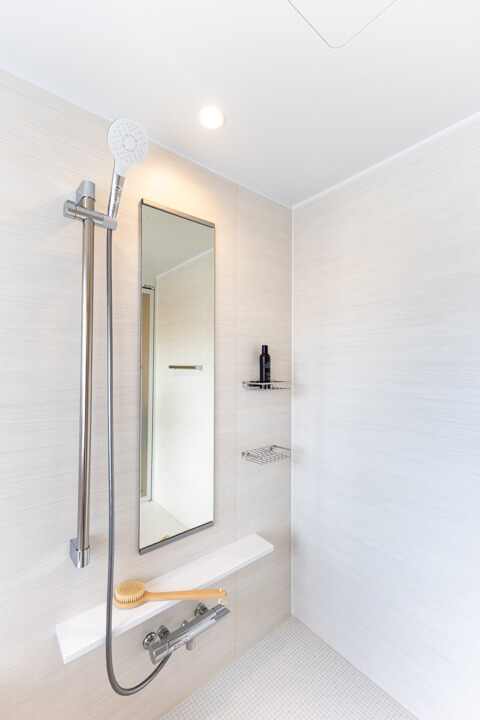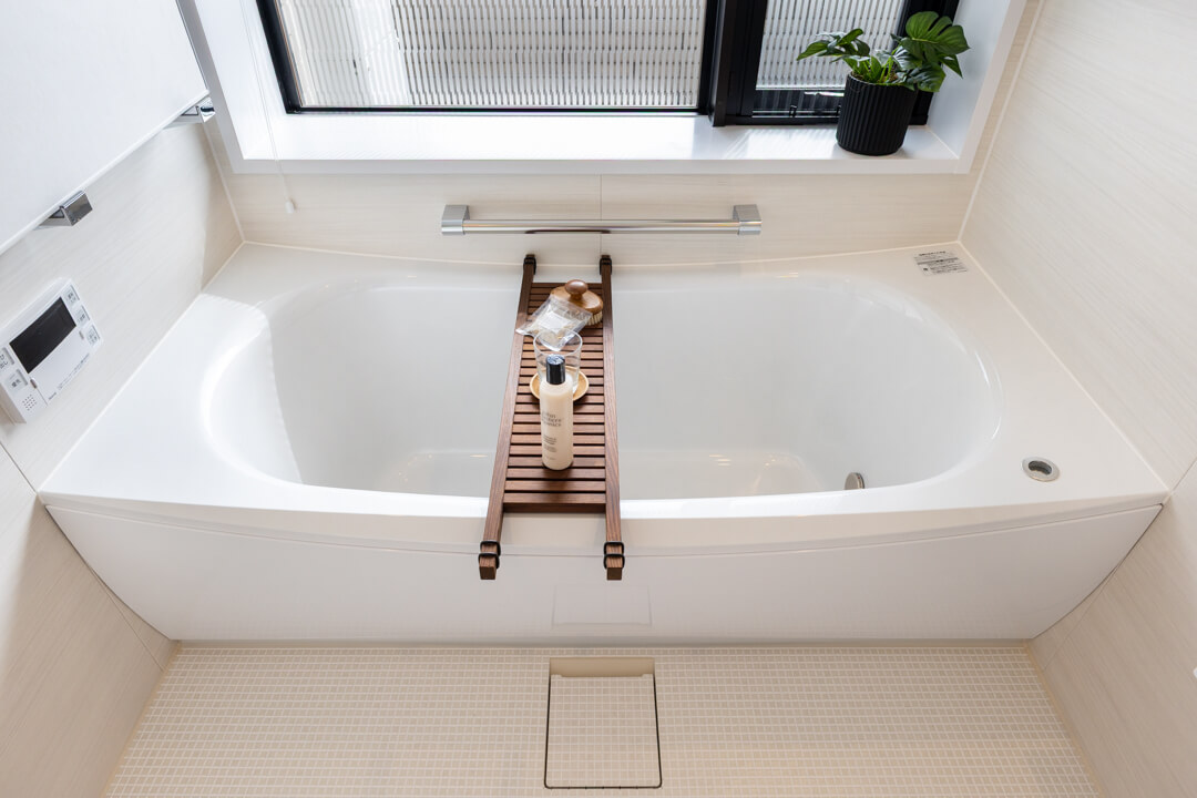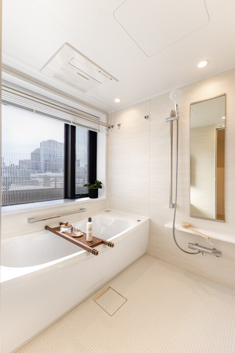 ゆったり入浴できる1620サイズのバスルーム。バルコニーに面する窓も付いていて、開放感溢れる空間です。丸みを帯びた浴槽が疲れた身体を包み込み、1日の終わりのリラックスタイムを。浴室暖房換気乾燥機・追い焚き機能搭載で、設備も充実しています。