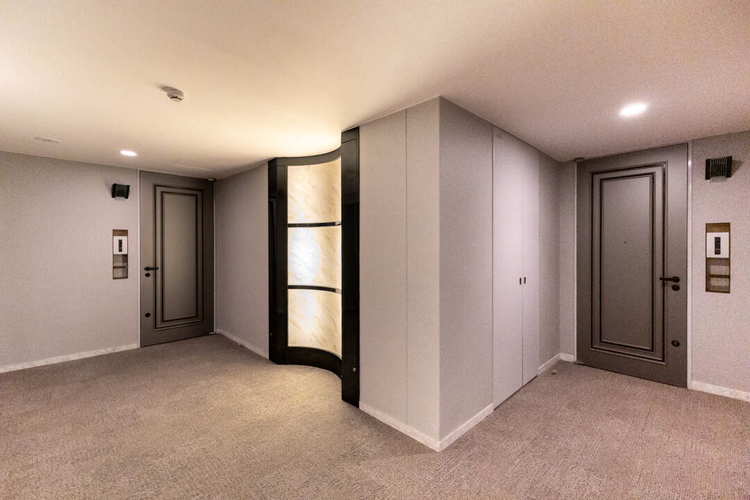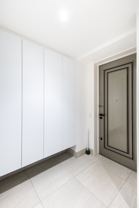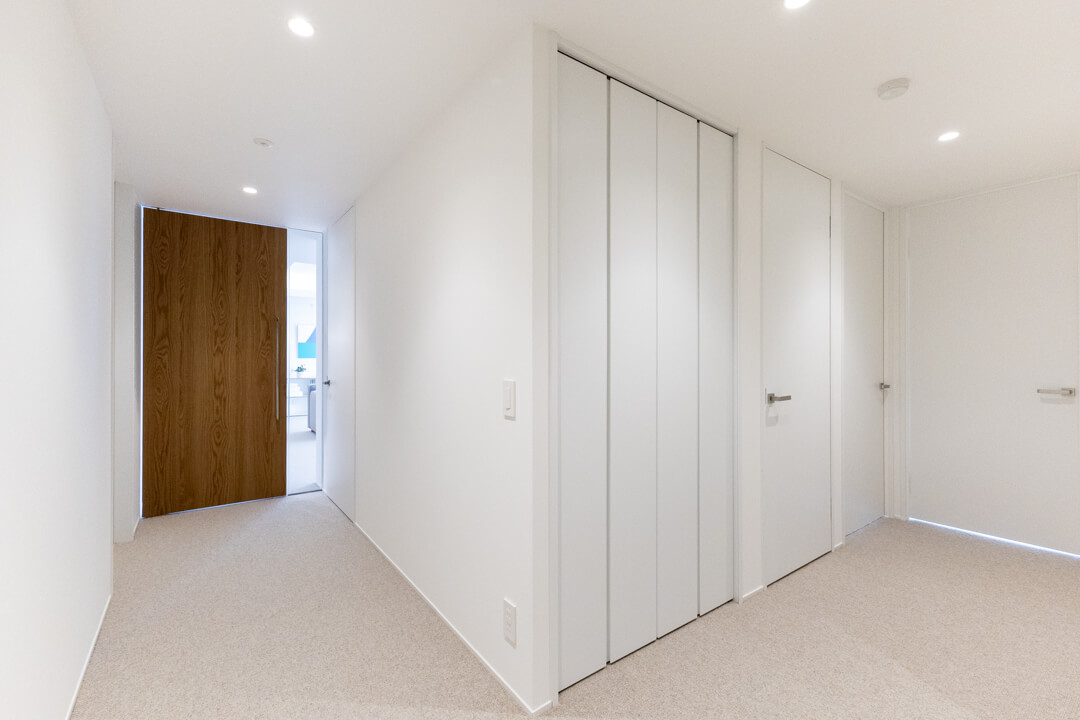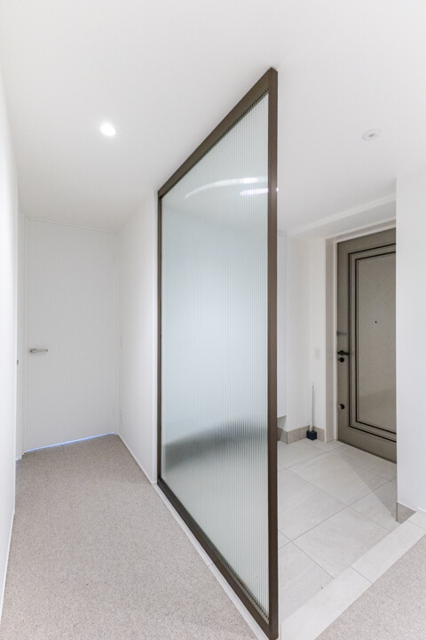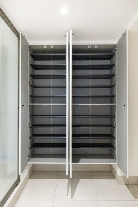 ガラスウォールがスタイリッシュに奥行きをもたらす玄関。大容量のシューズボックスとコートを掛けられる収納を完備しています。廊下には約2.5帖のSIC(シューズインクローゼット)と約1.5帖の納戸もあり、充実の収納が魅力的。靴はもちろん、掃除機や季節家電といった大きな荷物も収納できます。すっきりとした居住空間を実現できそうですね。