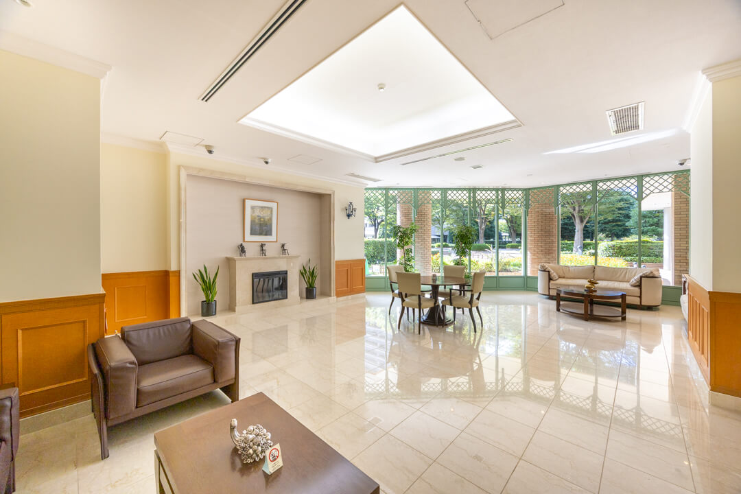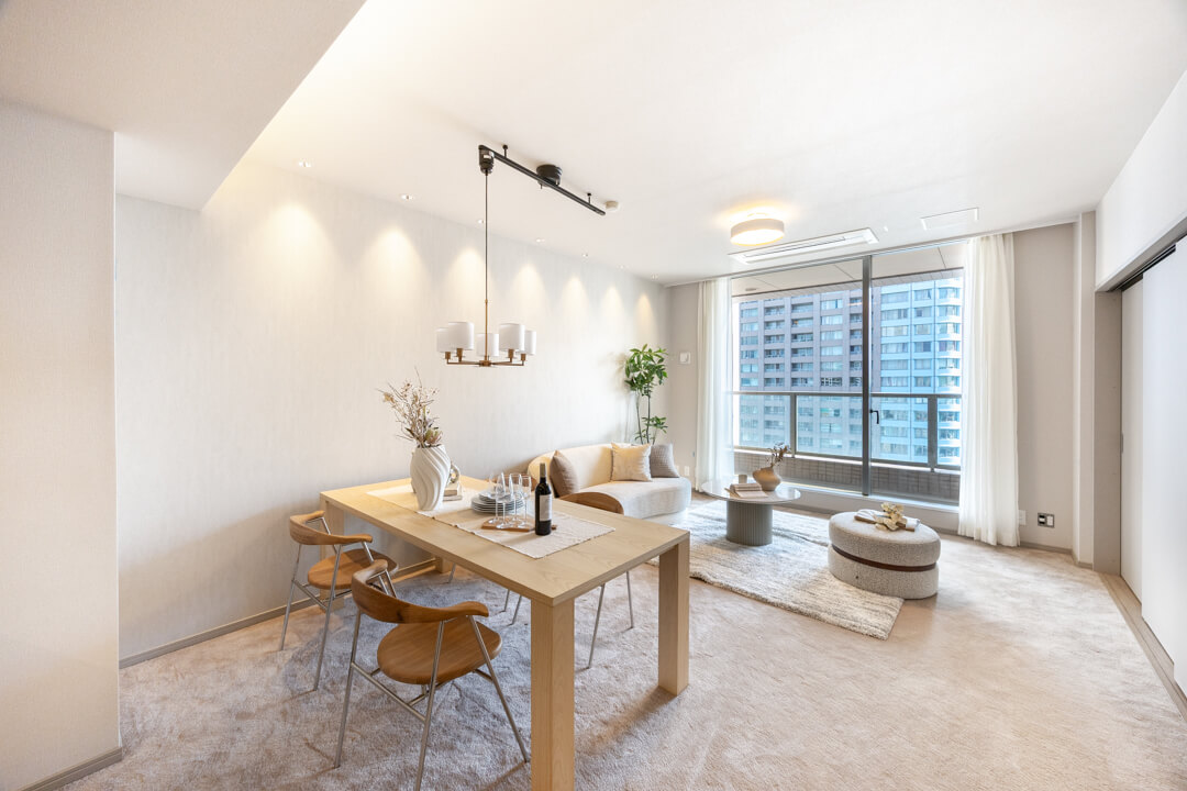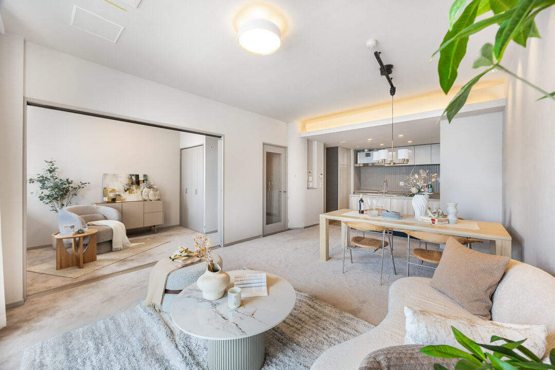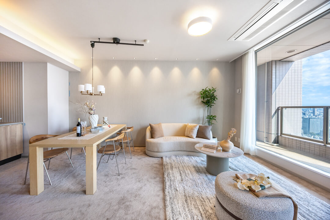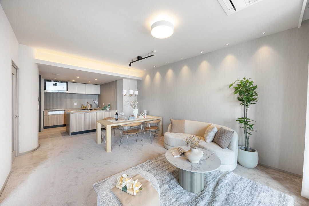 約19.0帖の広々としたリビングダイニングキッチンです。天井には間接照明があしらわれていて、上品な雰囲気が漂っています。また、エアコンは埋め込み式のため、インテリアの邪魔をしないのも◎。