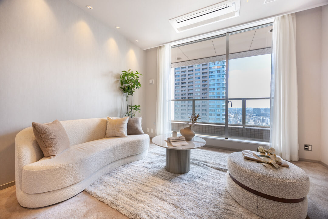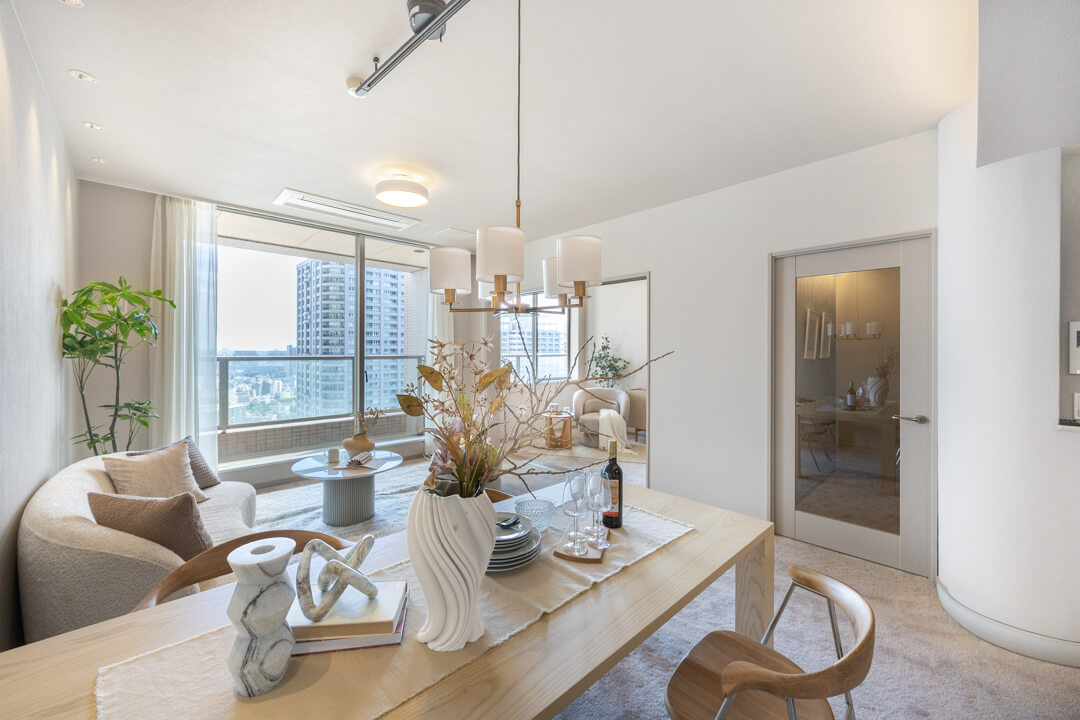 東京メトロ有楽町線・都営大江戸線「月島」駅より徒歩8分、隅田川の流れと江戸時代から続く下町情緒が残る佃エリアにそびえ立つビッグコミュニティマンションです。小中学校が徒歩5.6分のため、お子さまがいらっしゃる方は登下校の不安が軽減されるのではないでしょうか。お部屋は33階部分の3LDK。97㎡の広々とした空間で、隅田川や東京スカイツリーを望むことができます。夏には花火大会も楽しめます。