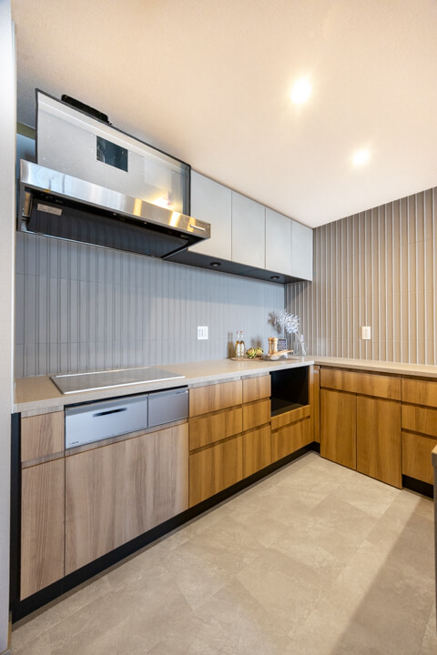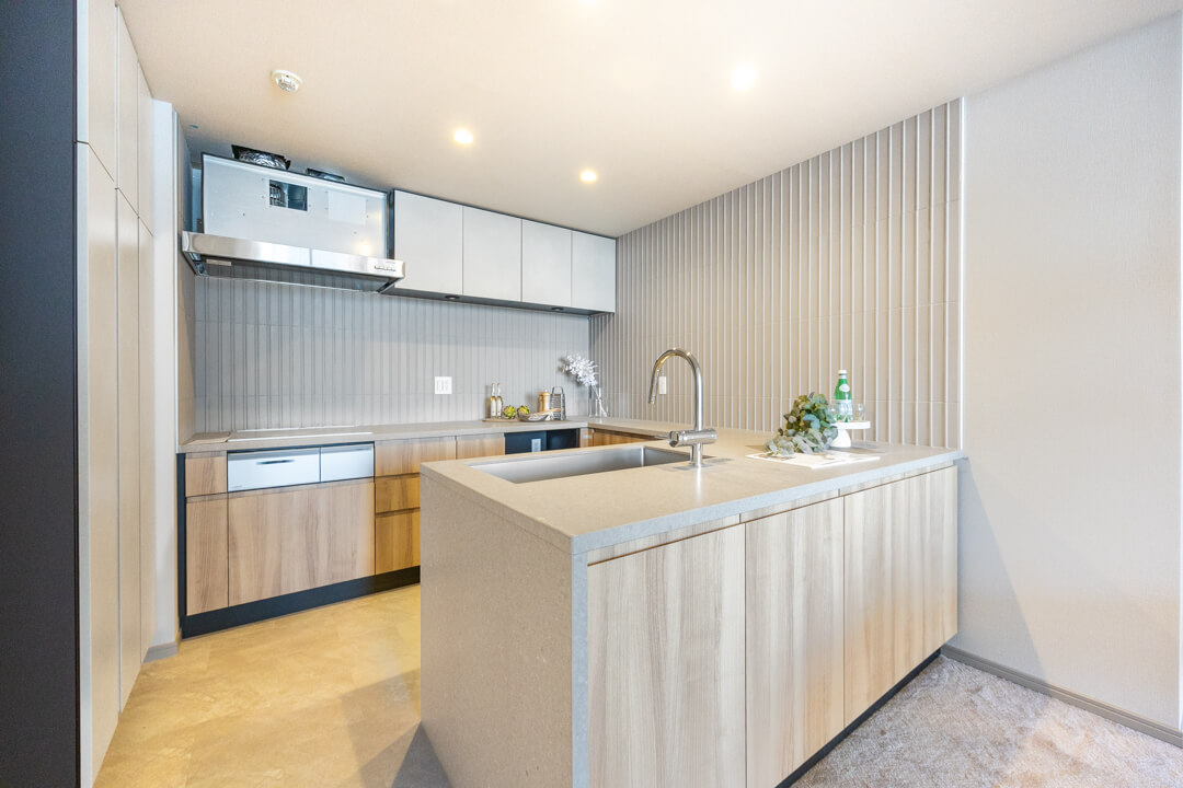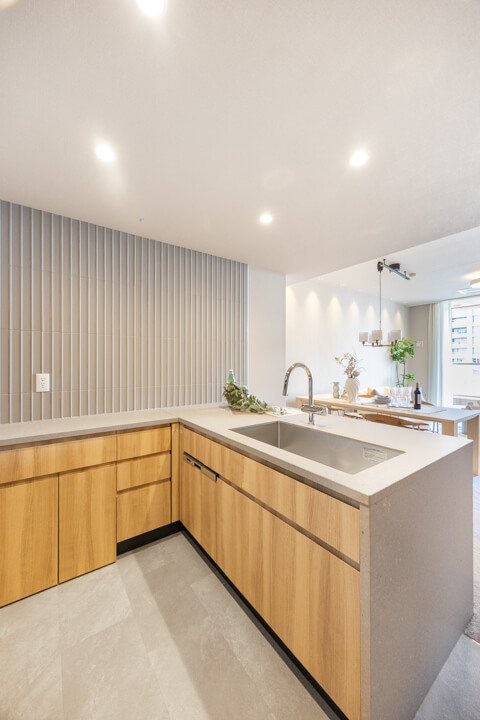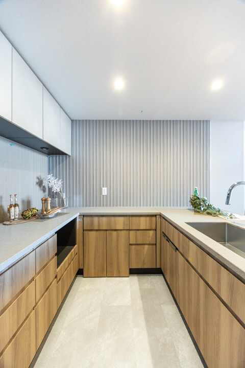 動線が最小限に済んで料理が捗るコの字型キッチンです。対面式にもなっているので、家族や来客とのコミュニケーションが取りやすくて◎。