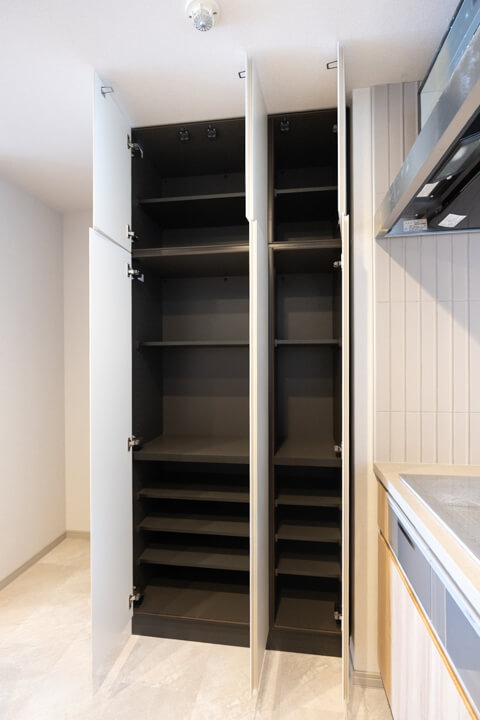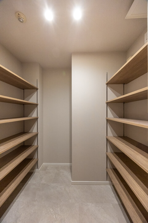 キッチン横には棚が造られているので、小物や調味料、ストック類などを収納することができます。