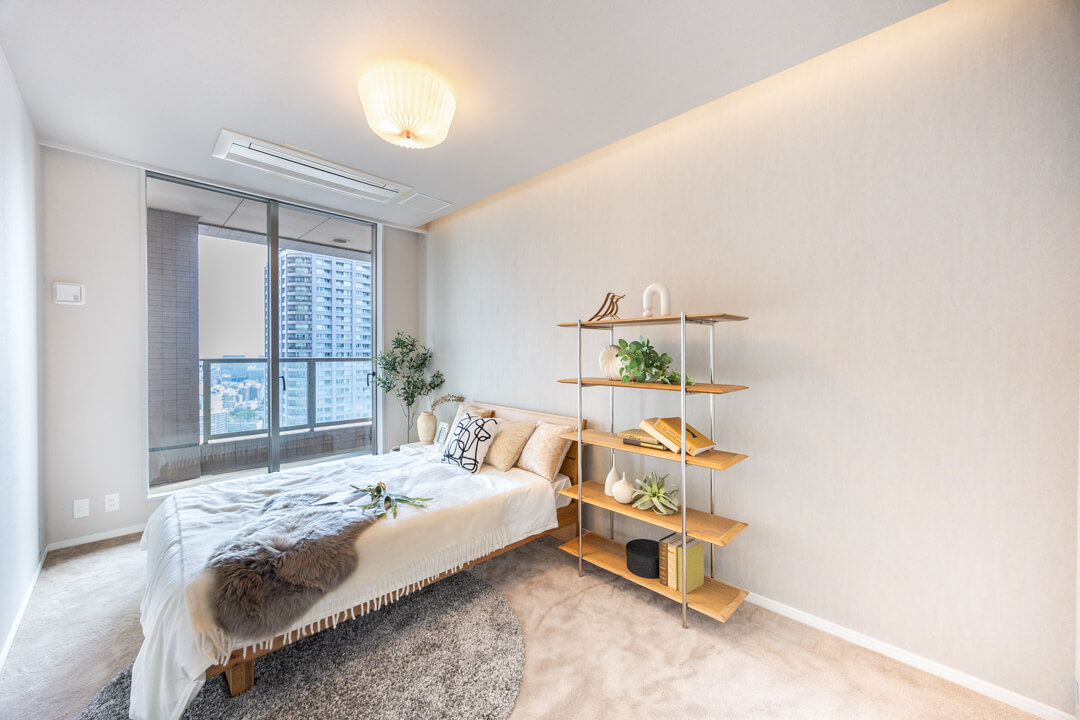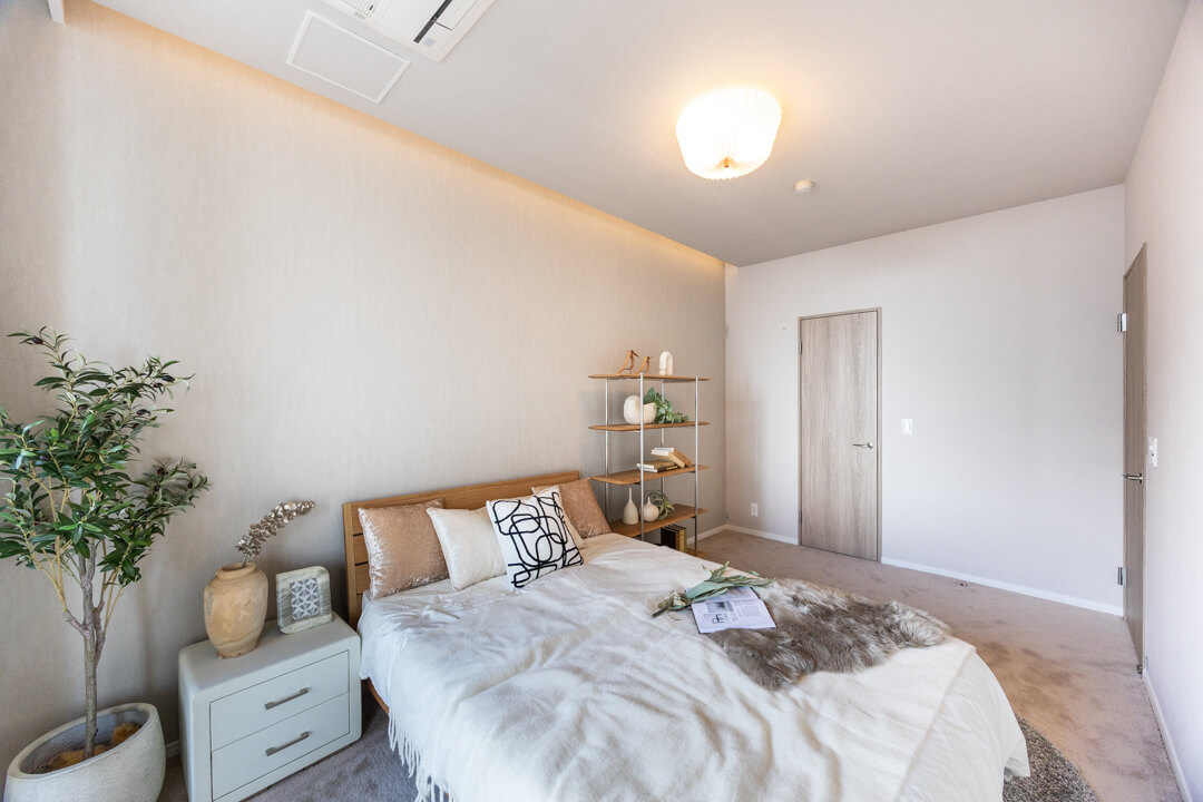 約8.0帖の洋室1は、ゆとりがあって主寝室に良さそうなお部屋です。天井には間接照明が設置されており、くつろぎ空間を演出してくれています。窓からはバルコニーにアクセスが可能。また、奥行きがあるウォークインクローゼットが造られているので、洋服や大きめの荷物も収納することができます。