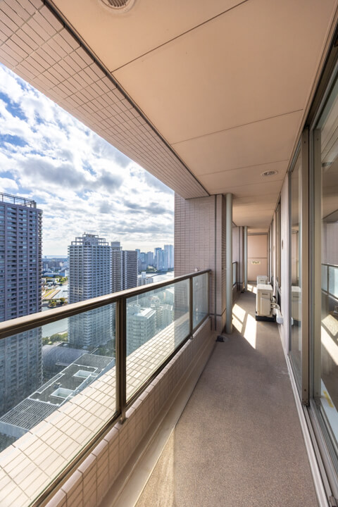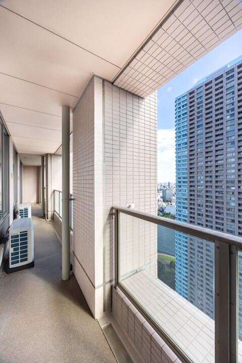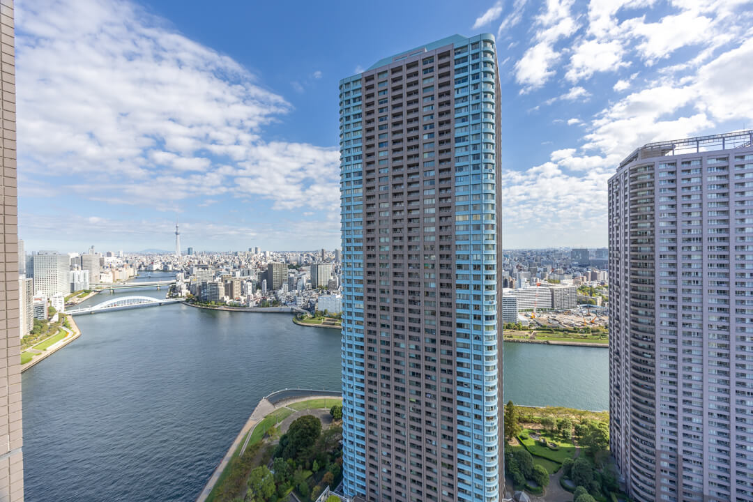 約15.5㎡のワイドスパンバルコニー。隅田川や晴海運河の穏やかな流れと、東京スカイツリーを望む開放的な眺望が魅力的です。夏には花火大会も楽しむことができますよ。