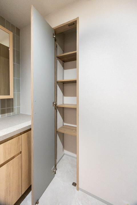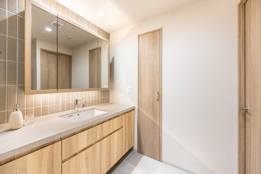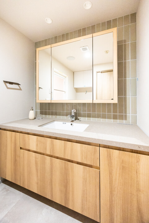 ナチュラルな雰囲気を醸し出している洗面化粧台です。大きな三面鏡の中には化粧品などを収納できて使い勝手が良好。カウンターも広めで身だしなみが整えやすそうです。また、横には棚があり、リネン類や洗剤などを収納することができます。また、天井にはBluetooth対応の埋込型デジタルステレオアンプが設置されています。スマートフォンなどからお好きな音楽を再生することができますよ。