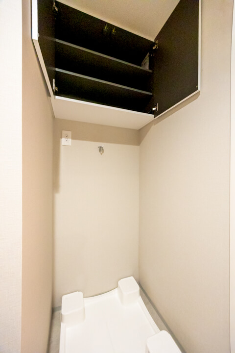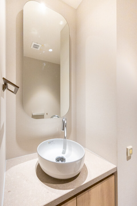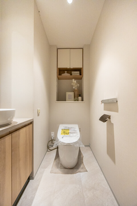 ウォシュレット一体型のトイレです。タンクレスタイプなのですっきりとした印象に。また、別途で手洗い器と鏡が造られているので、すぐに手を洗うことができて衛生的です。上部には吊戸棚が設置されていて、収納スペースもありますよ。カウンタースペースにはアロマなどを置いても◎。